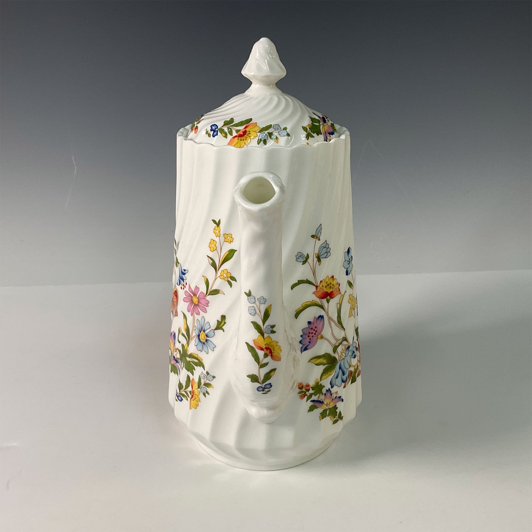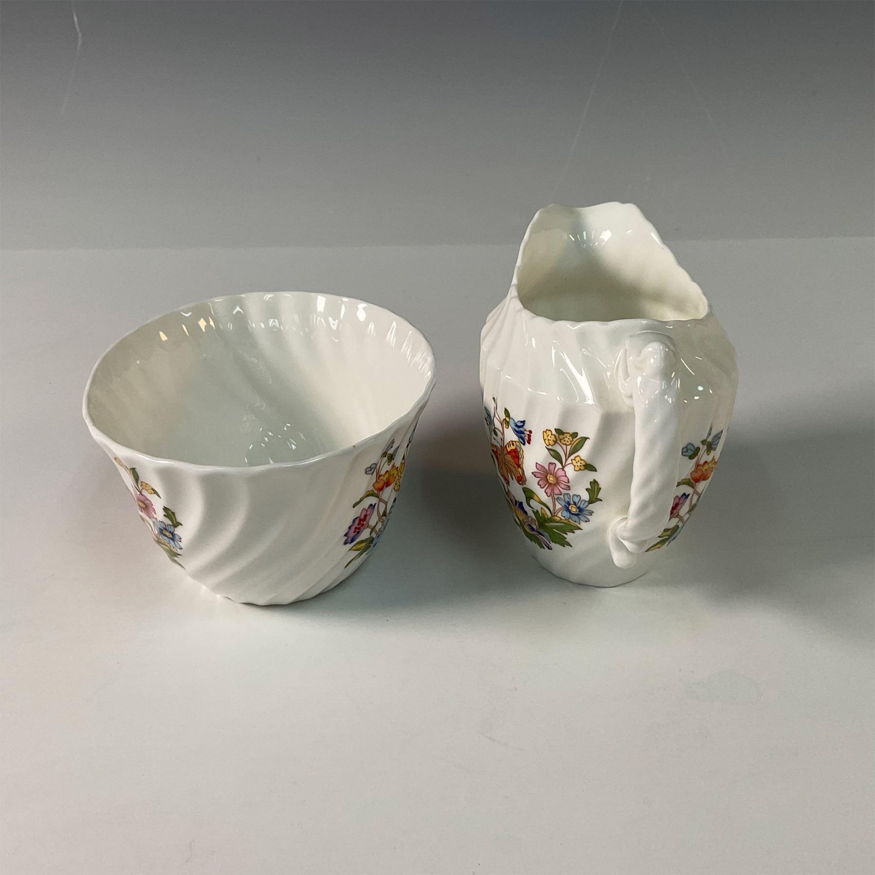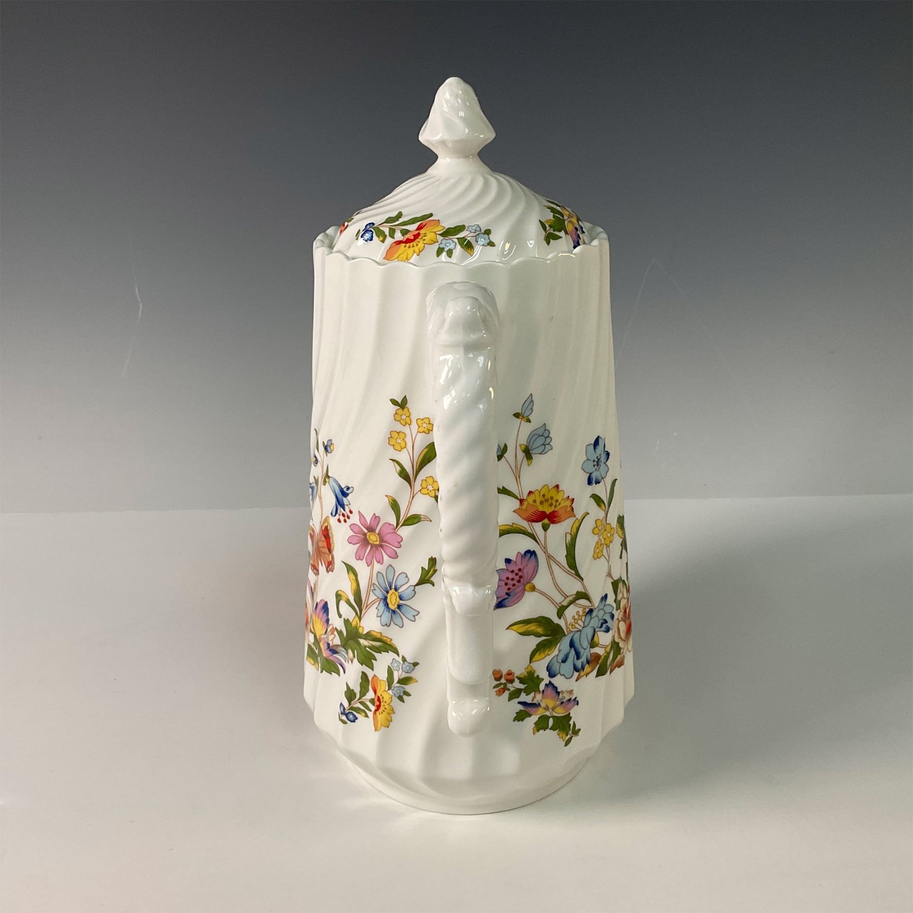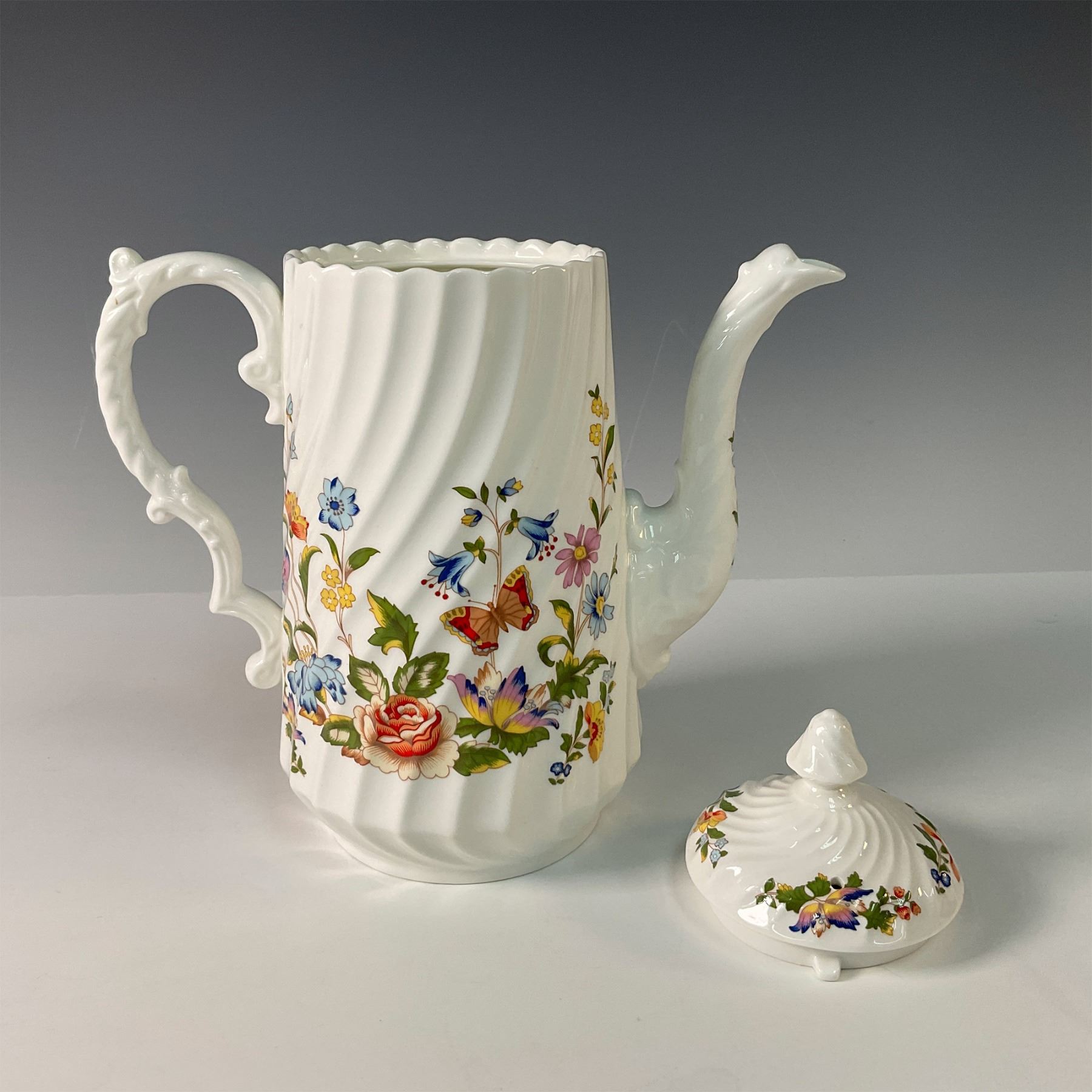 A delightful trio of Aynsley bone china pieces in the Cottage Garden pattern with a swirl, including a covered coffee pot, open sugar bowl, and creamer. This charming set features the vibrant floral designs of an English cottage garden, accented with colorful butterflies, and showcases Aynsley's fine craftsmanship. The coffee pot's elegant shape and the sugar bowl and creamer's detailed design make this set both functional and decorative. A perfect addition to any fine china collection or table setting. Aynsley backstamps. Coffee pot: 9.5"H. Sugar bowl: 2.25"H. Creamer: 3.5"H.
