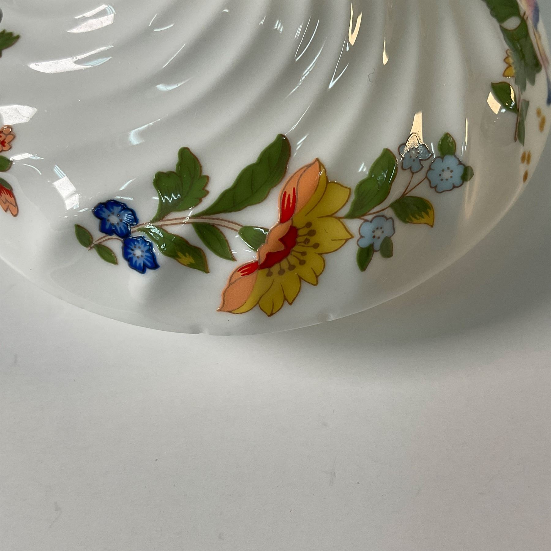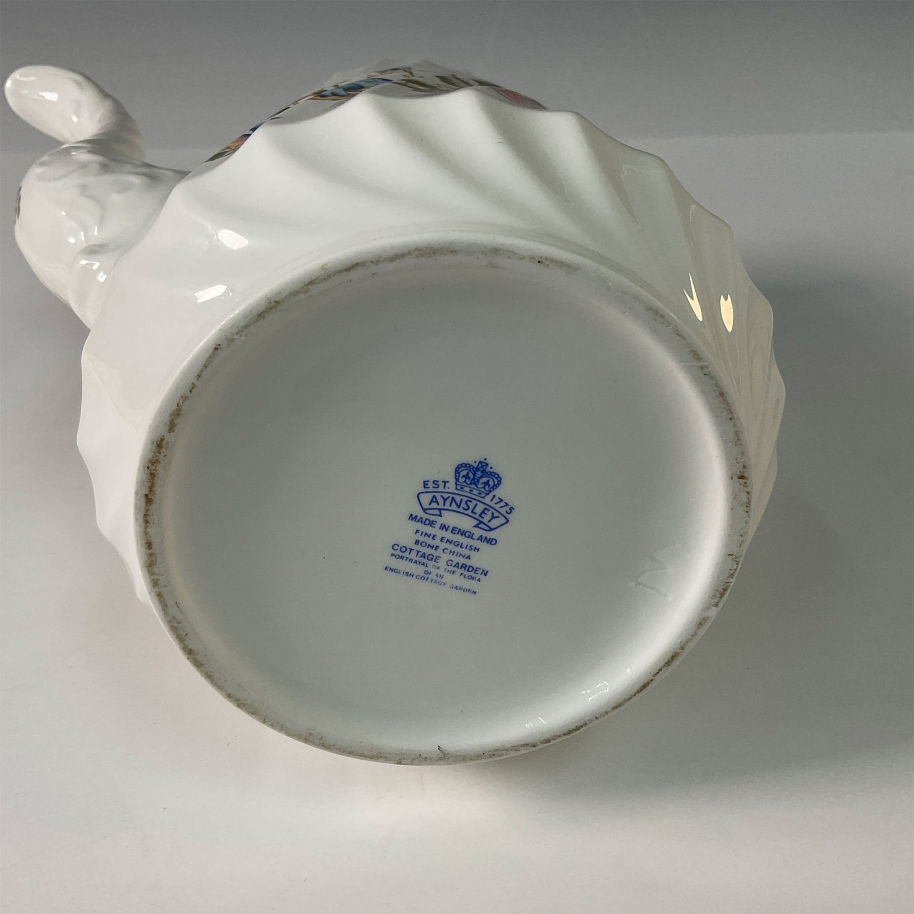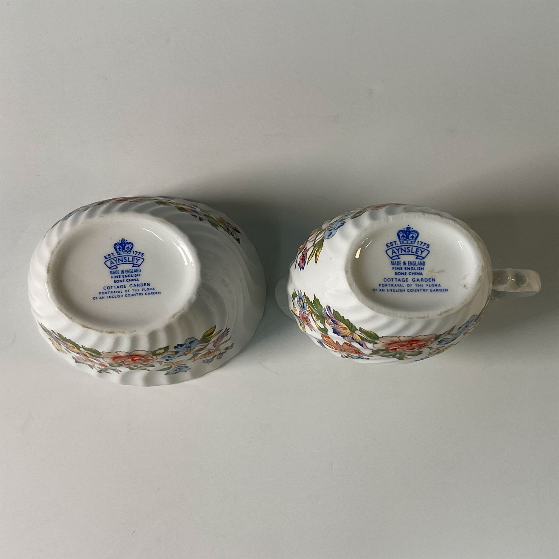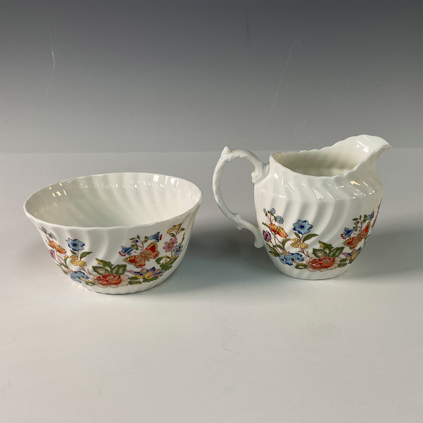 A delightful trio of Aynsley bone china pieces in the Cottage Garden pattern with a swirl, including a covered coffee pot, open sugar bowl, and creamer. This charming set features the vibrant floral designs of an English cottage garden, accented with colorful butterflies, and showcases Aynsley's fine craftsmanship. The coffee pot's elegant shape and the sugar bowl and creamer's detailed design make this set both functional and decorative. A perfect addition to any fine china collection or table setting. Aynsley backstamps. Coffee pot: 9.5"H. Sugar bowl: 2.25"H. Creamer: 3.5"H.