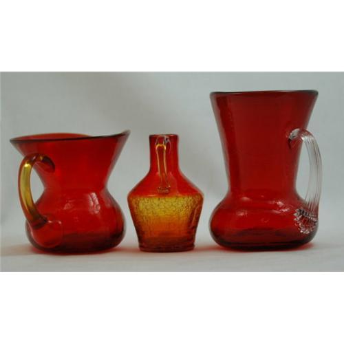 Three pieces of crackle glass, two in ruby and one in amberina. The one of the left is a crackle glass pitcher in ruby that was made by the Blenko Glass Company. It is 4 1/4" tall and has a very wide mouth (4 1/2" x 4"). The one in the middle is an amberina crackle glass miniature jug that is 4 1/2" tall and was made by the Pilgrim Glass Company (no longer in business). The third is a crackle glass pitcher that was made by the Blenko Glass Company and is 5 1/2" tall and has a crystall hand applied reeded handle. All pieces are hand blown with no damage.