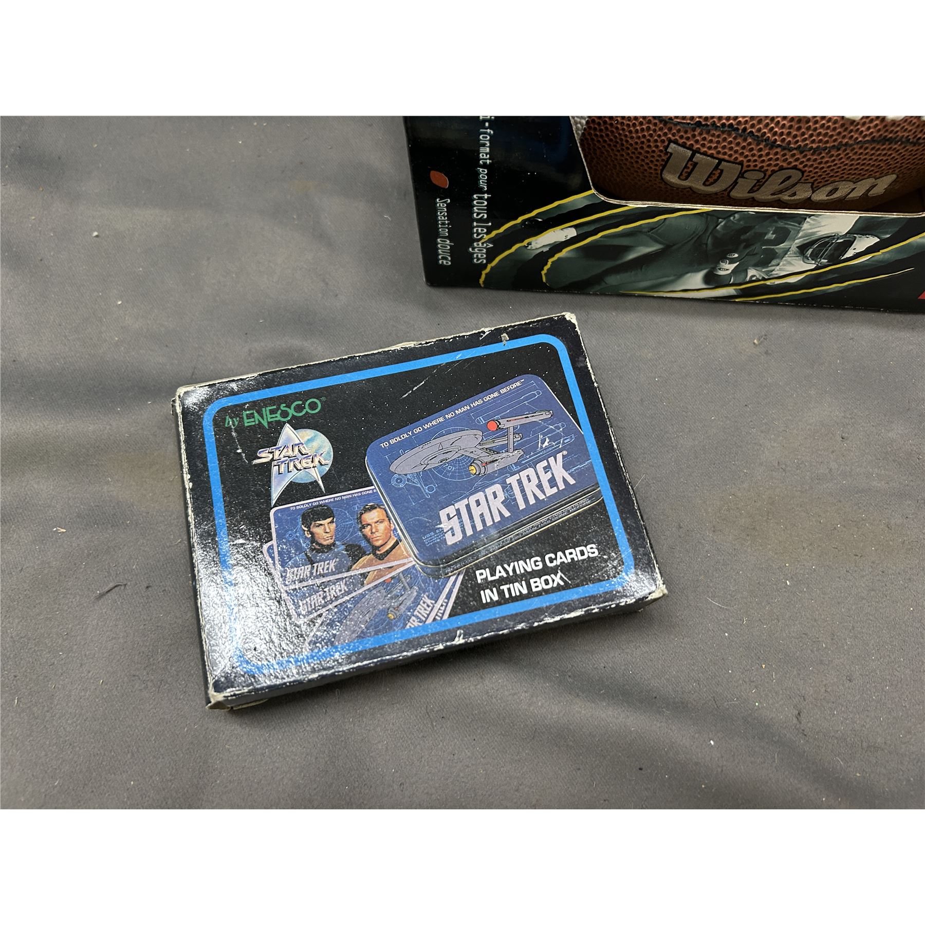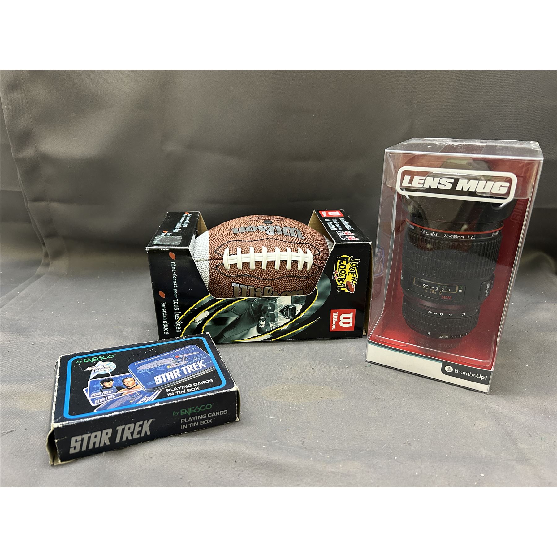 3pcs of New Old Stock Camera Lens Mug Thermos, Wilson Football, Star Trek Playing Cards