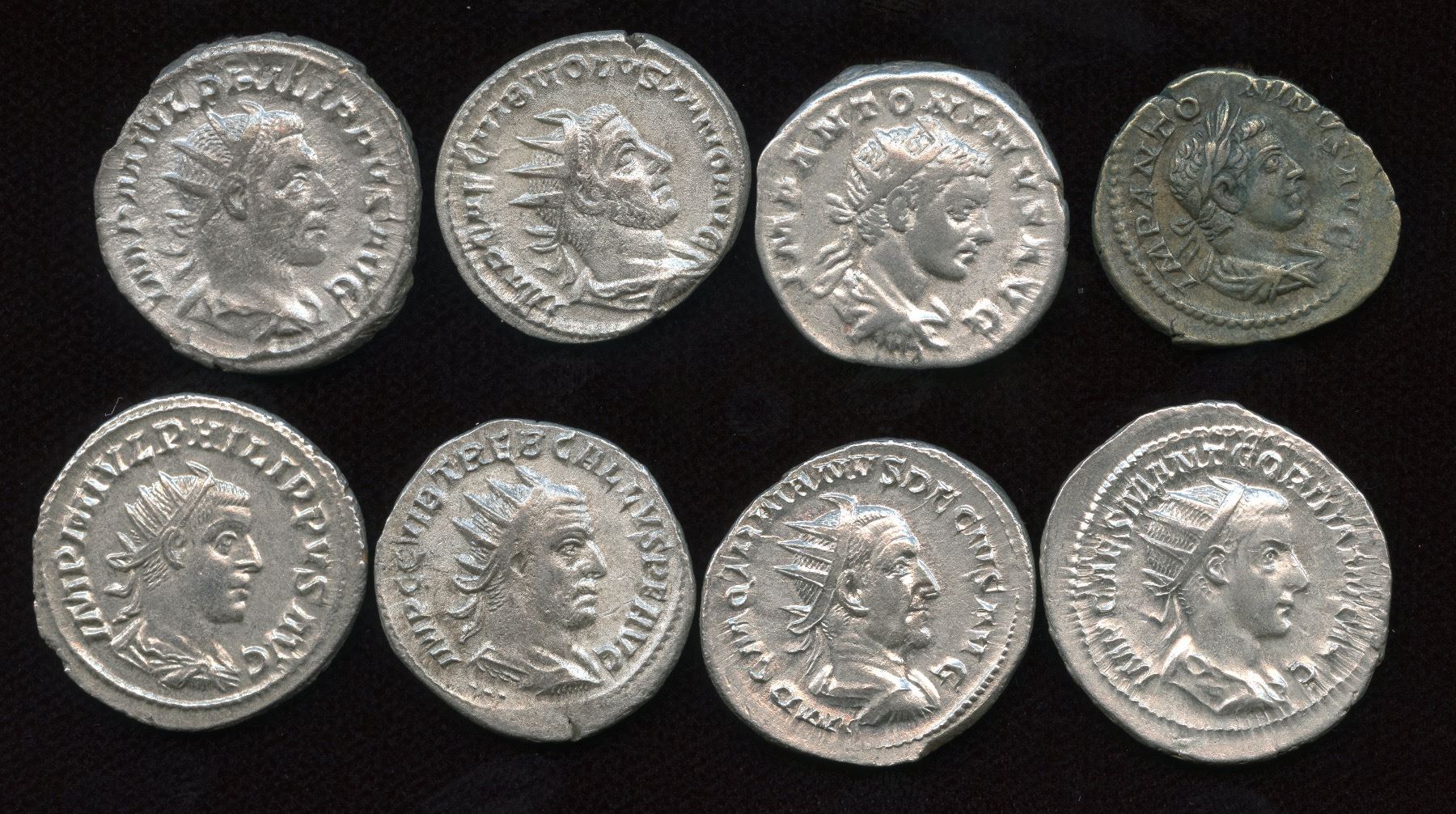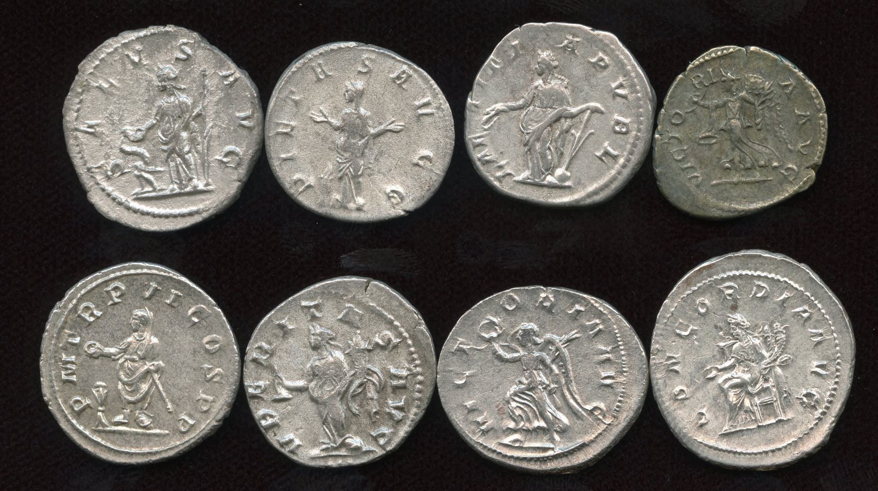 Elagabalus, Antoninianus, reverse - Lætitia standing left, 5.72g (RSC 72), Victory walking left 3.17g; together with other Antoninianii (6), of Gordian III, Philip I and II, Trajan Decius, Trebonius Gallus and Volusian [8 pieces] Very fine or better.