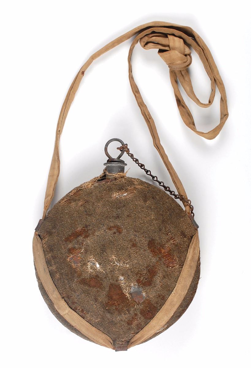 Model 1858 smooth side canteen, measuring approximately 8? in diameter and 3? thick, retaining its original carrying strap and about eighty percent of its original brown cloth cover. Also retains its original metal and cork stopper and chain. Despite significant wear, the dark stencil of crossed rifles with an “A” above and a “3, CT” below are discernible on one side of the cloth covering, indicating Company A of the 3rd Connecticut Volunteer Infantry. In very good condition, with several dents to the body and aforementioned wear to cover.