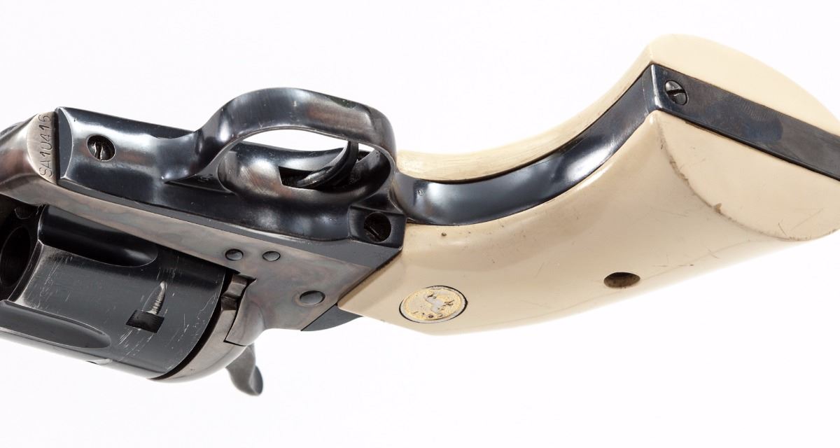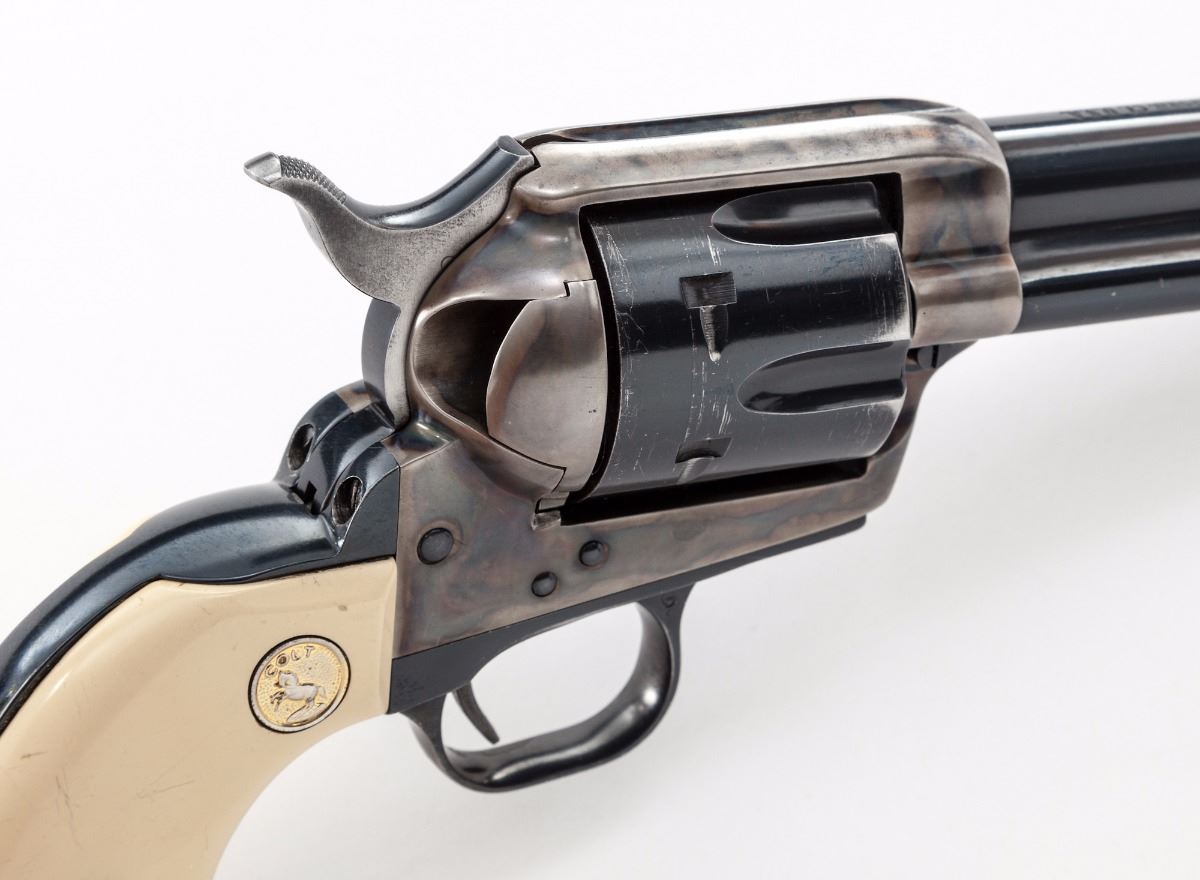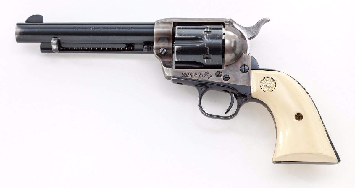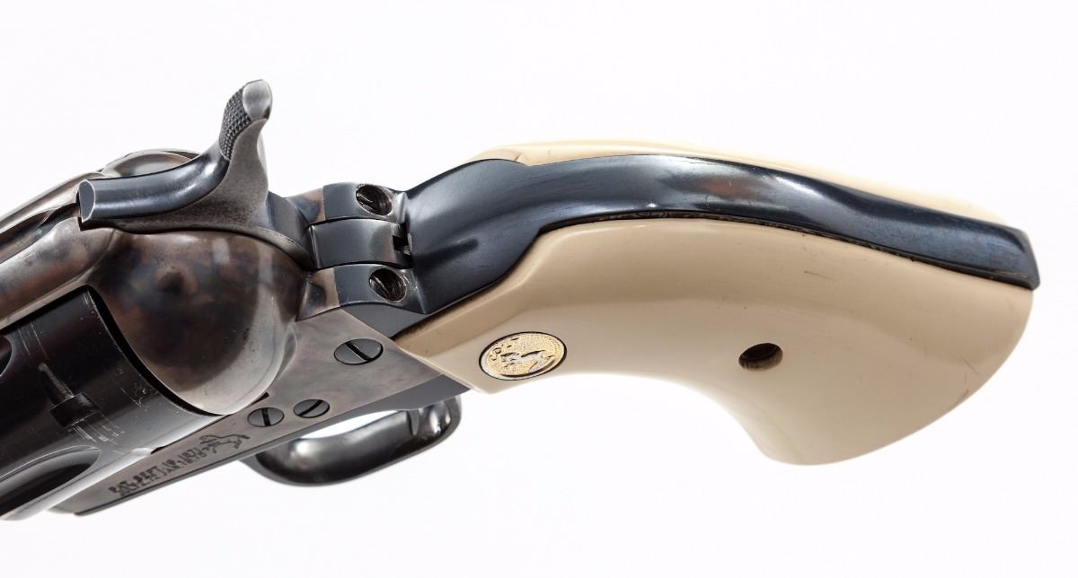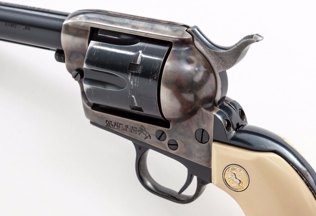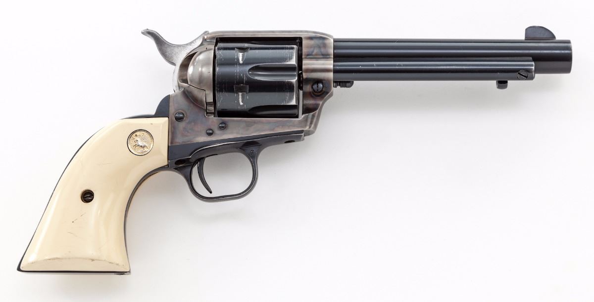 3rd Gen. Colt Single Action Army Revolver, #SA10416, .45 LC cal., 5-1/2'' barrel, blue and case hardened finish, faux ivory grips with inlaid Colt medallions, and standard sights. Top of barrel with one-line Colt barrel address. Condition is fine retaining approx. 95% blue with most of the wear to the muzzle and cylinder; frame retains approx. 95%-97% lightly fading case colors. Faux ivory grips are slightly undersized. Overall the revolver shows signs of use and would make a fine shooter. Action is smooth and crisp, bore is excellent. Est.: $900-$1,200. (Modern)