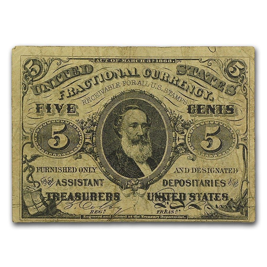 3rd Issue Fractional Currency 5 Cents Fine+ (FR#1238) his Third Issue Fractional note is a Five Cent denomination, and features a portrait of Spencer Clark, 1st Superintendent of the National Currency Bureau, now the Bureau of Engraving and Printing. This issue has a green back with Friedberg #1238. This note is in Fine plus condition.