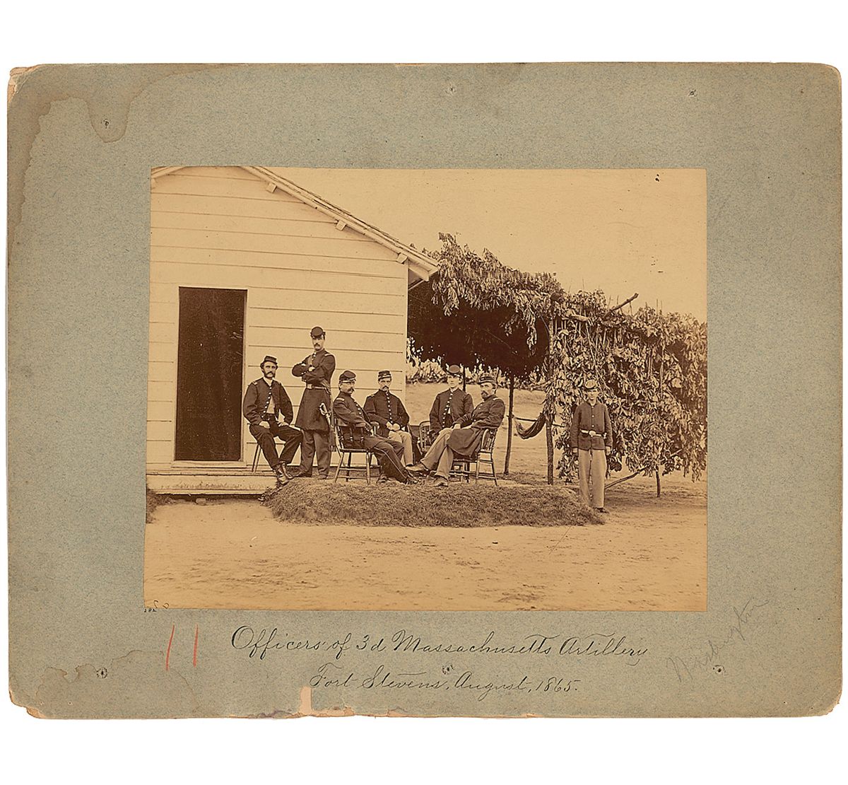 Original albumen photo of the officers of companies, F and K, 3rd Regiment Massachusetts Artillery, posing out in front of a building at Fort Stevens in August of 1865, affixed to its original 14 x 11 mount, captioned on the mount in an unknown hand. Photo was credited to Mathew Brady and his team. In very good condition, with tack holes and dampstaining to mount, some light surface loss, rippling, and edge tears to bottom, and some light surface marks to image.