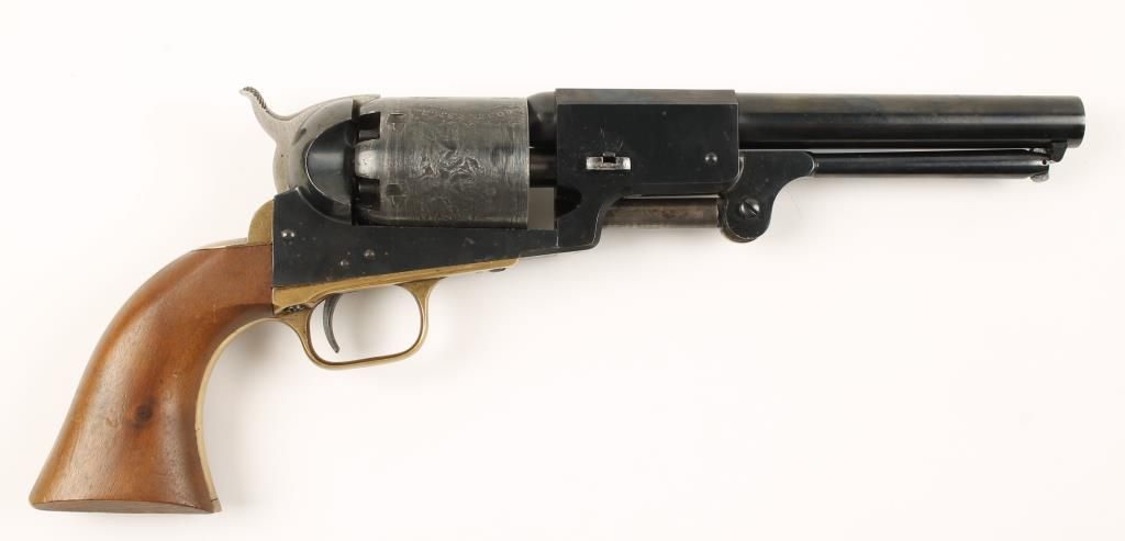 Replica black powder single action 6-shot pistol. 7-1/2" blued octagon barrel. Blued and case colored loading lever. Blued and engraved cylinder showing an indian battle. Blued frame. Brass trigger guard and backstrap. Not cut for a shoulder stock. Condition is good. *Antique Firearm*