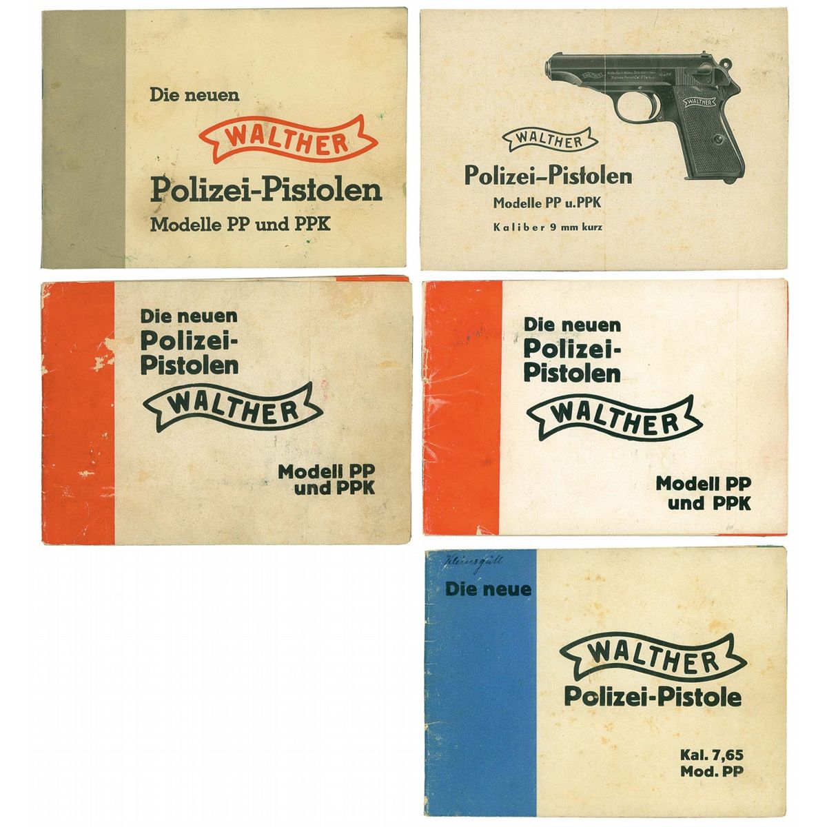 1) Walther Police Model PP 7.65 mm pistol manual (7652-4/34), blue stripe on cover hand marked "Klirusgull", 24 pages, dated 1934. 2) Walther Police Model PP/PPK 9mm pistol folded manual. 3) Walther Police Model PP/PPK 7.65mm pistol manual, red stripe on cover, 32 pages. 4) Walther Police Model PP/PPK 7.65mm pistol manual, red stripe on cover, 32 pages. 5) Walther Police Model PP/PPK 7.65mm manual (Nr. 118. 50 000.-12.36.C.E.), gray stripe on cover, dated 1936. Used in the period of 1934-1936.