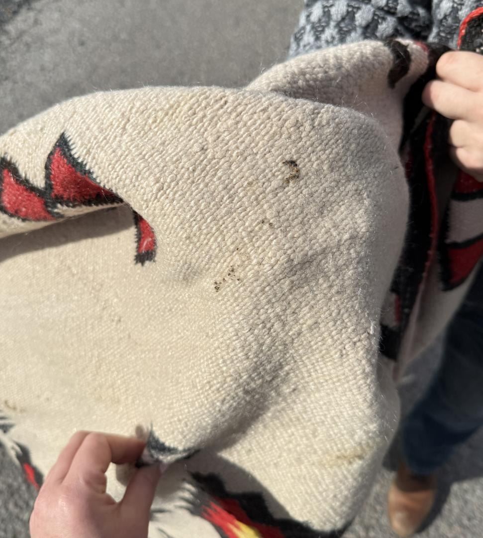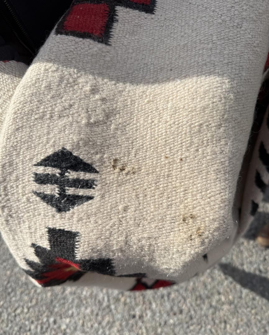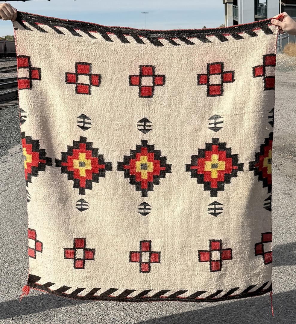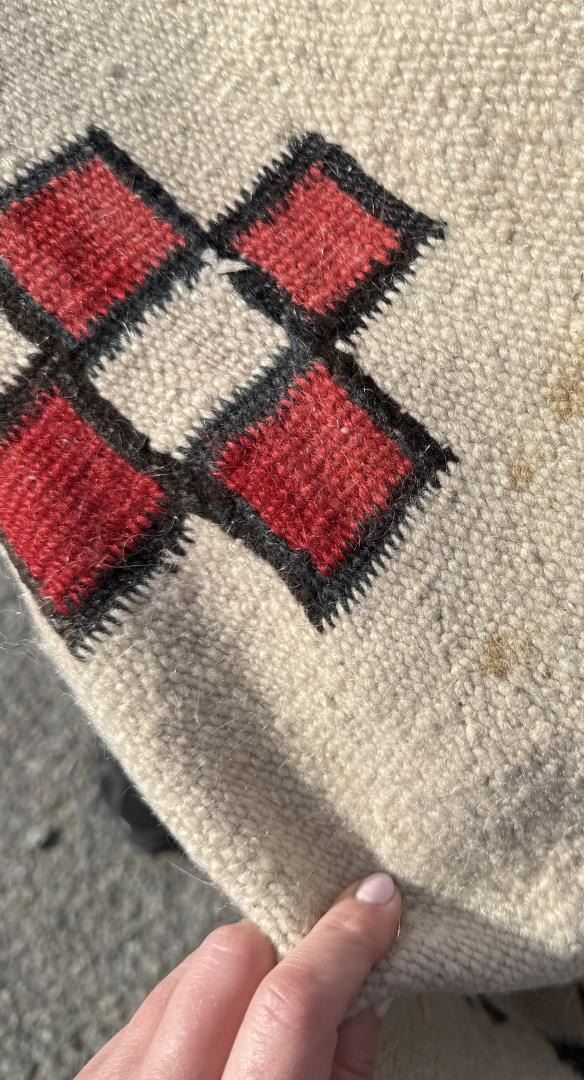 48" by 49". Some breakage as shown, areas of color bleed. Unusual pattern.