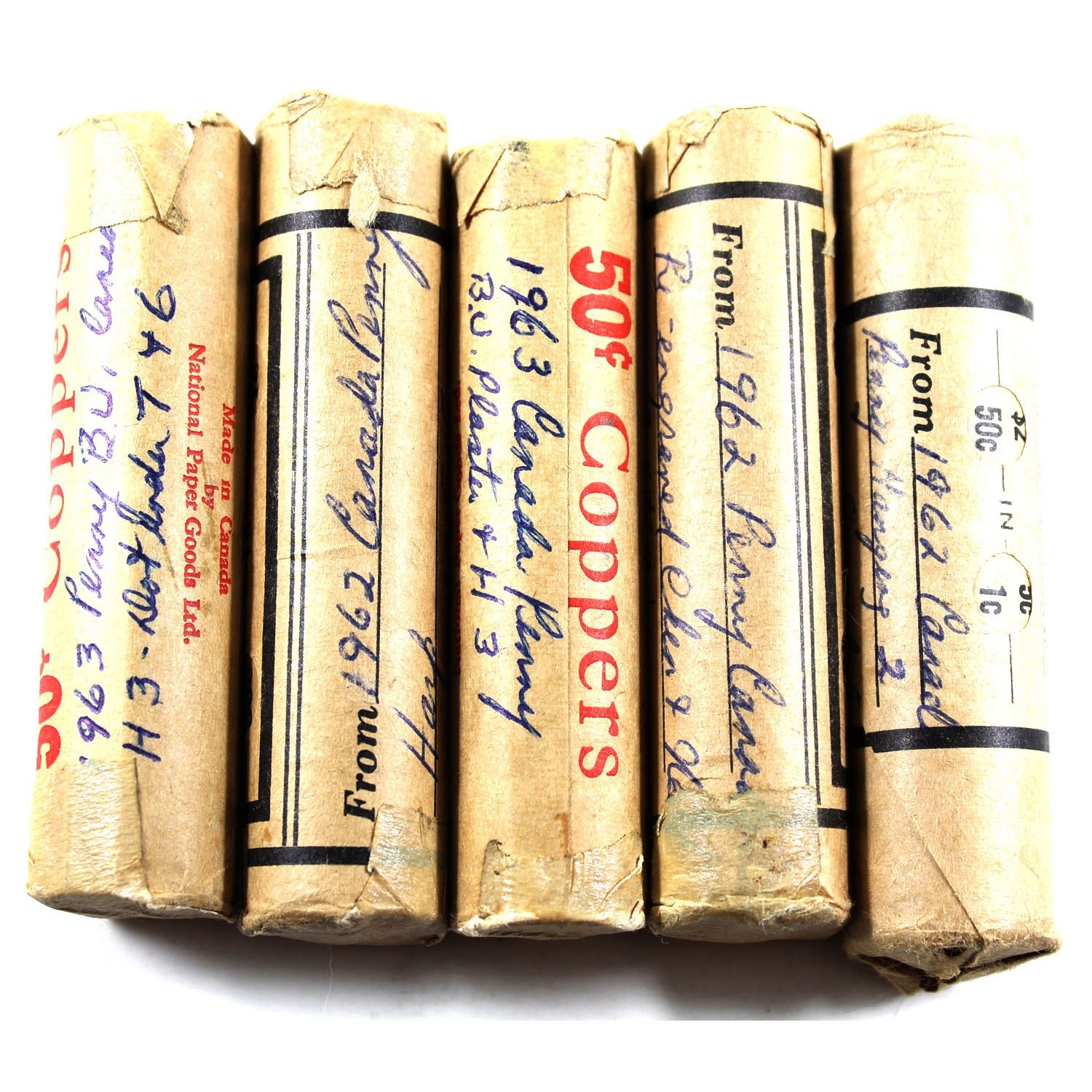 3x 1962 & 2x 1963 Canada 1-cent Rolls with Various Varieties as marked. 5 Rolls.