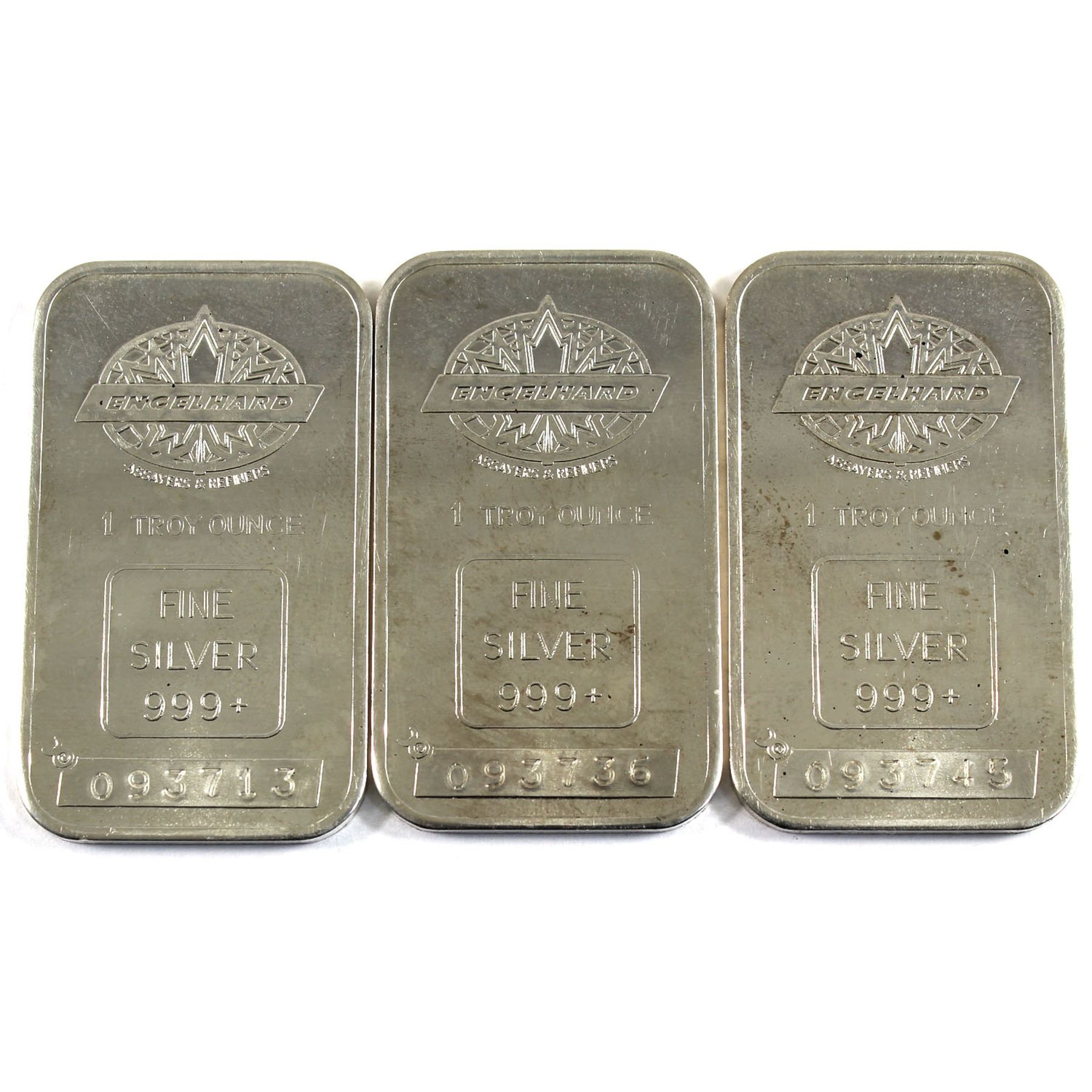 3x 1981 Engelhard 'Maple Leaf' 1oz Silver Bar Collection (TAX Exempt). Serial #093736, #093713, #093745. 3pcs.