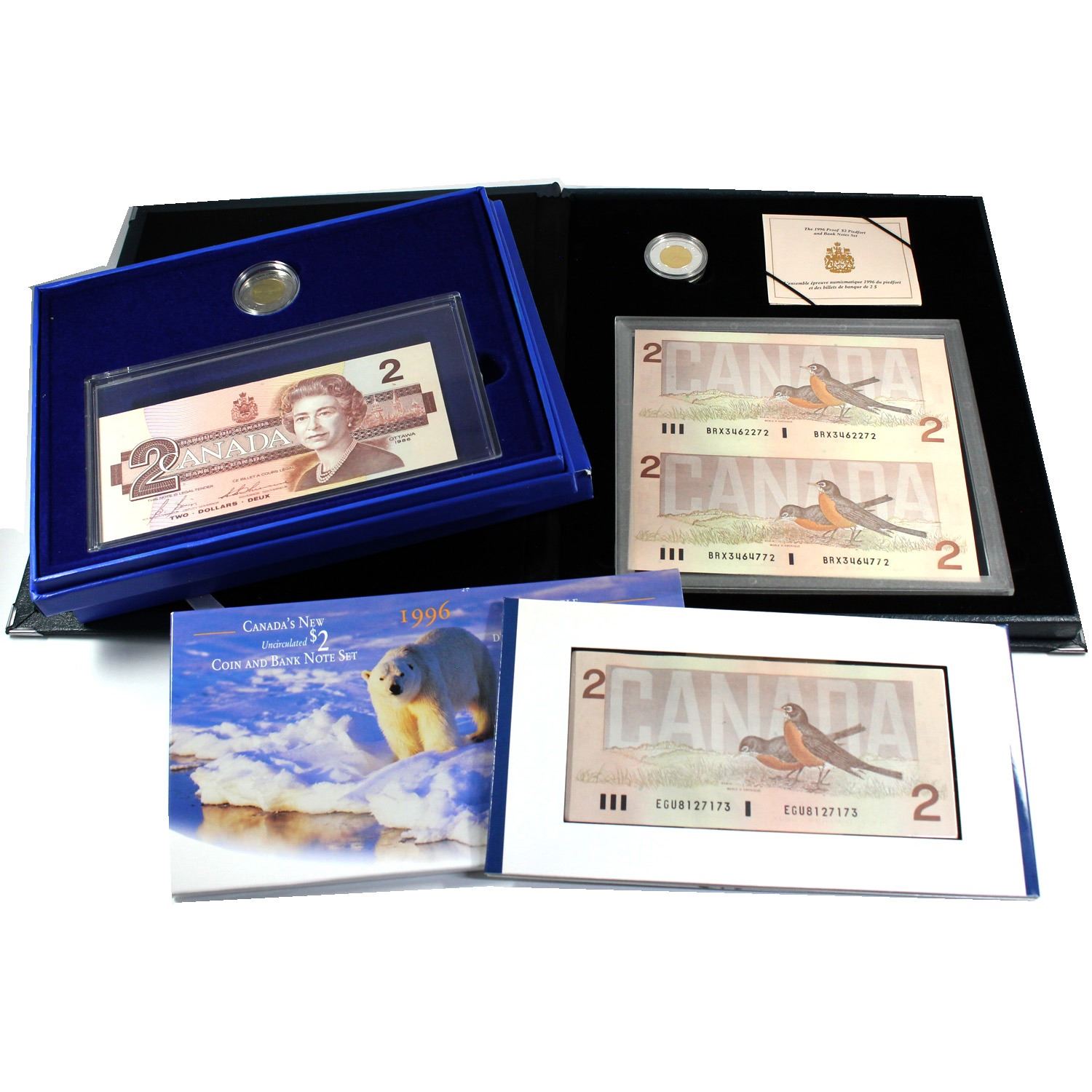 3x 1996 commemorative $2 sets: 1996 Silver Piedfort $2 and paper money set, 1996 Canada $2.00 Uncirculated Coin and Bank Note Set and the 1996 Canada $2 Proof Coin and BRX Replacement Note Set in original blue box ( worn box). 3pcs
