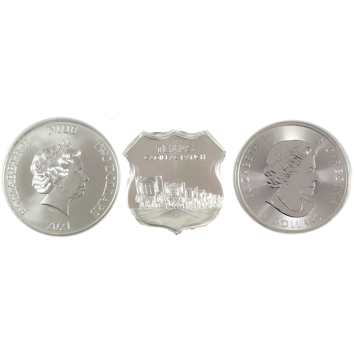INCLUDES: 2017 $5 150th Anniversary of Canada (heavy milk spots), Icons of Route 66 Shield - Texas Cadillac Ranch, & Niue 2021 $2 Back to the Future II. 3pcs. (Tax Exempt)
