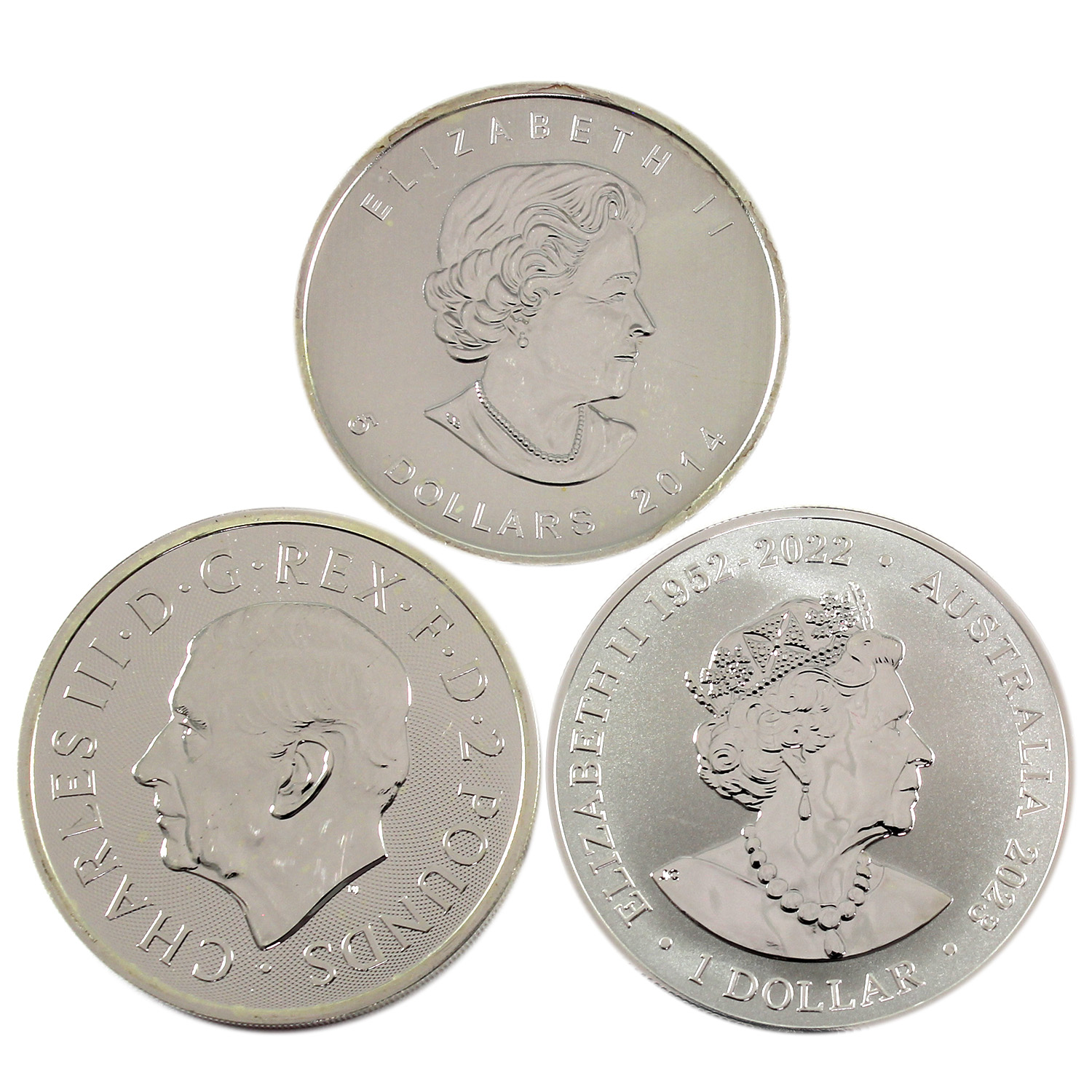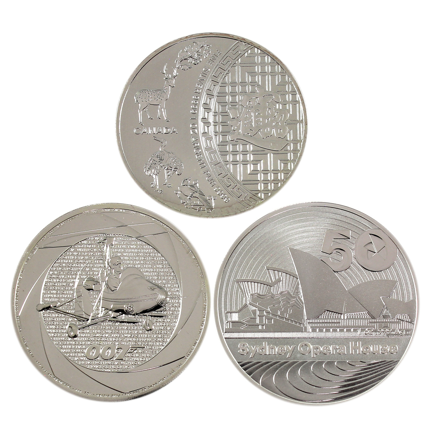 INCLUDES: Canada 2014 $5 Five Blessings, Australia 2023 $1 Sydney Opera House & Great Britain 2024 2 Pounds 007 Bond of the 60's. 3pcs