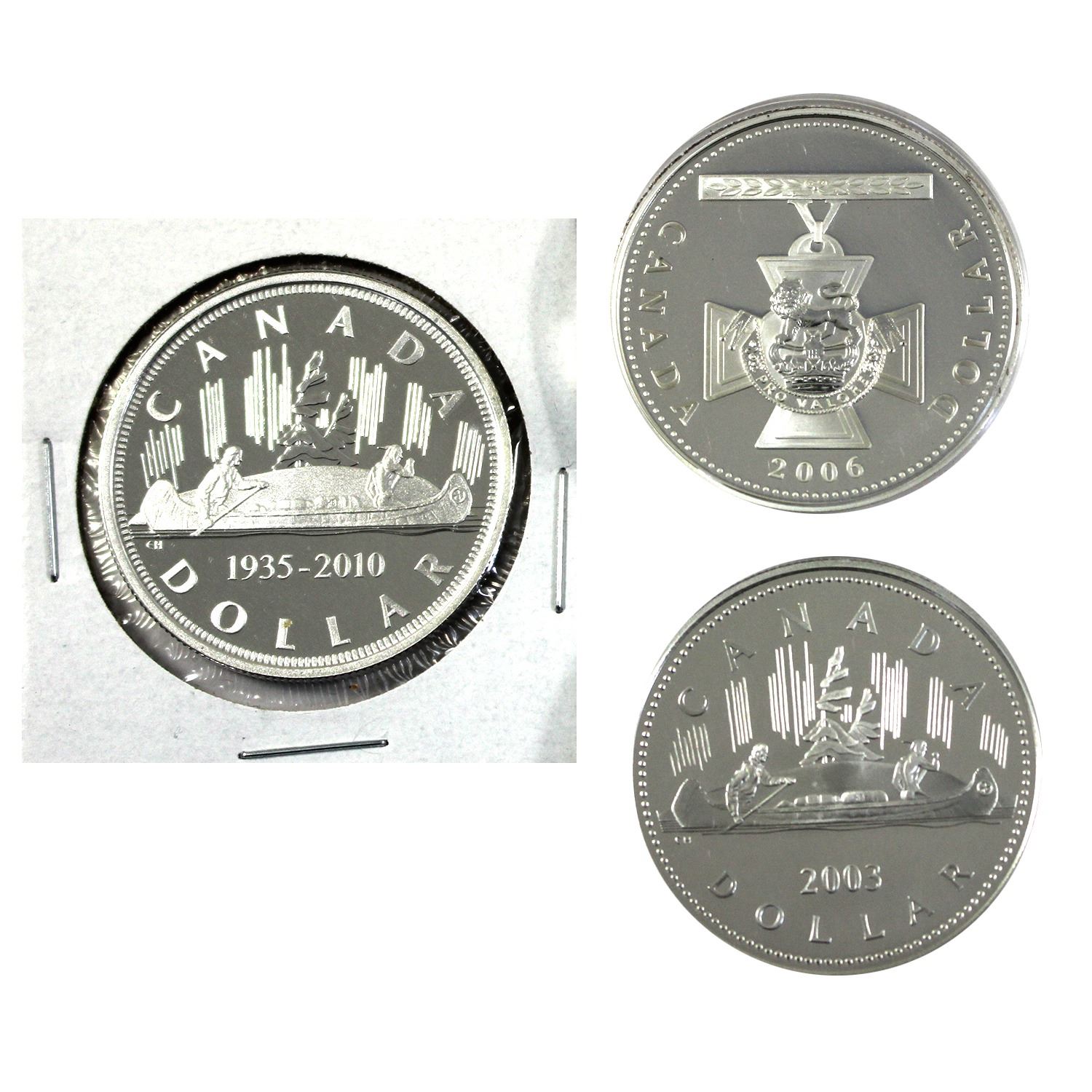 3x 2003-2010 $1 Silver Commemorative Coins. Lot Includes: 2003 Golden Jubilee (.9999 Fine), 2006 Victoria Cross (.9999 Fine), & 1935-2010 75th Anniversary of Canada's Voyageur Silver Dollar (.925 Fine). Coins only. 3pcs.