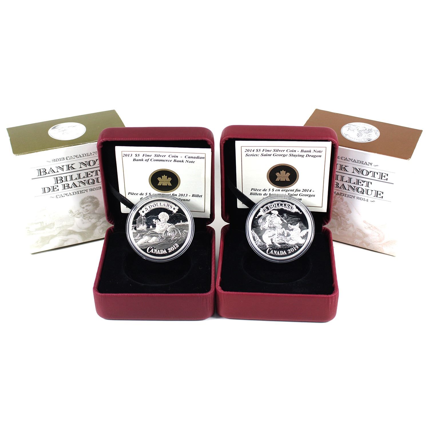 3x 2013-2014 $5 Canadian Banknote Fine Silver Coins. Lot Includes: 2013 Canadian Bank of Commerce, & 2014 Saint George Slaying the Dragon. Lightly toned. 2pcs. (Tax Exempt)