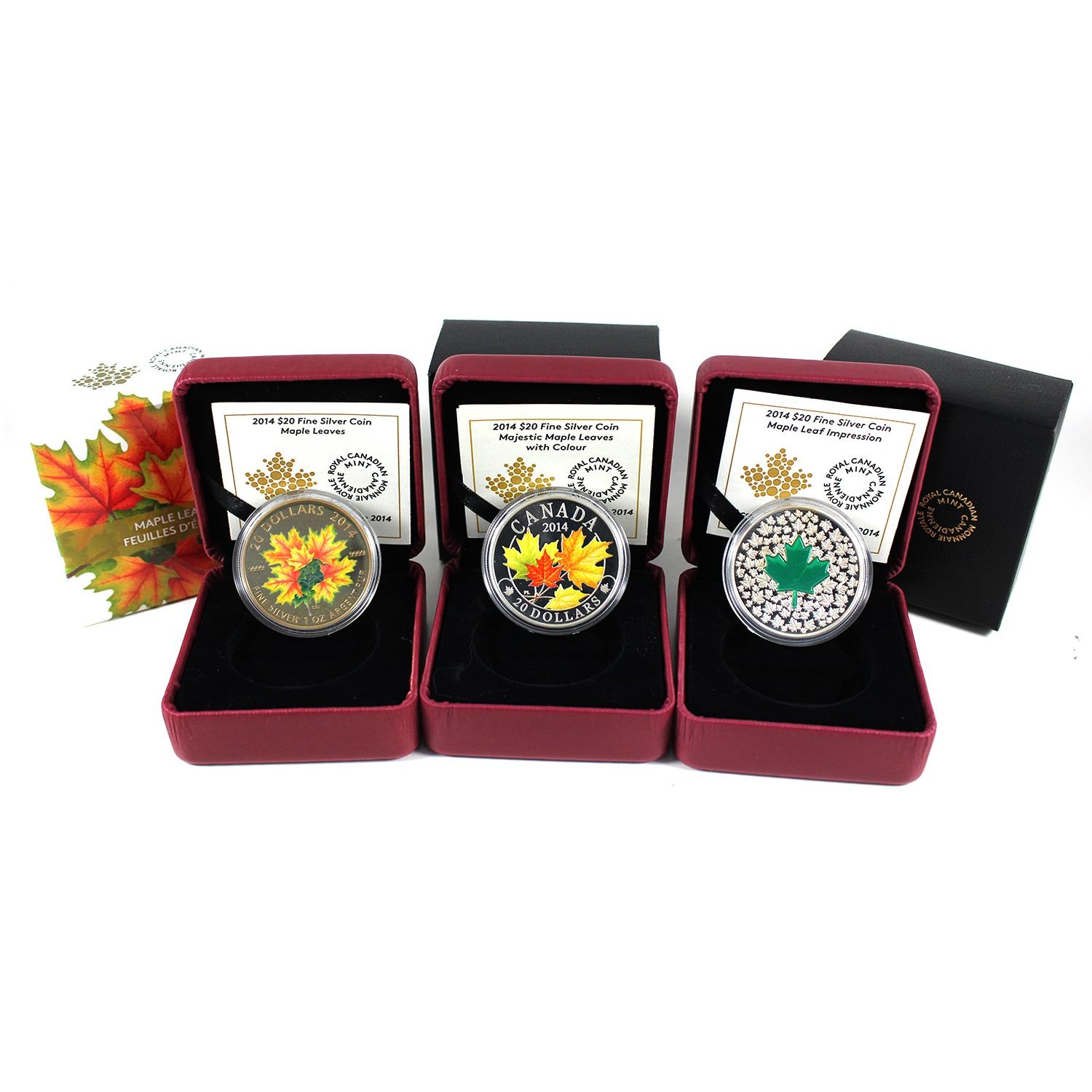 3x 2014 $20 Maple Leaves Fine Silver Coins. Lot Includes: Maple Leaf Impression, Majestic Maple Leaves, & Glow-in-the-Dark Maple Leaves. Hues of Gold and Amber. Wear and tear to capsules and outer sleeves. 3pcs. (Tax Exempt)