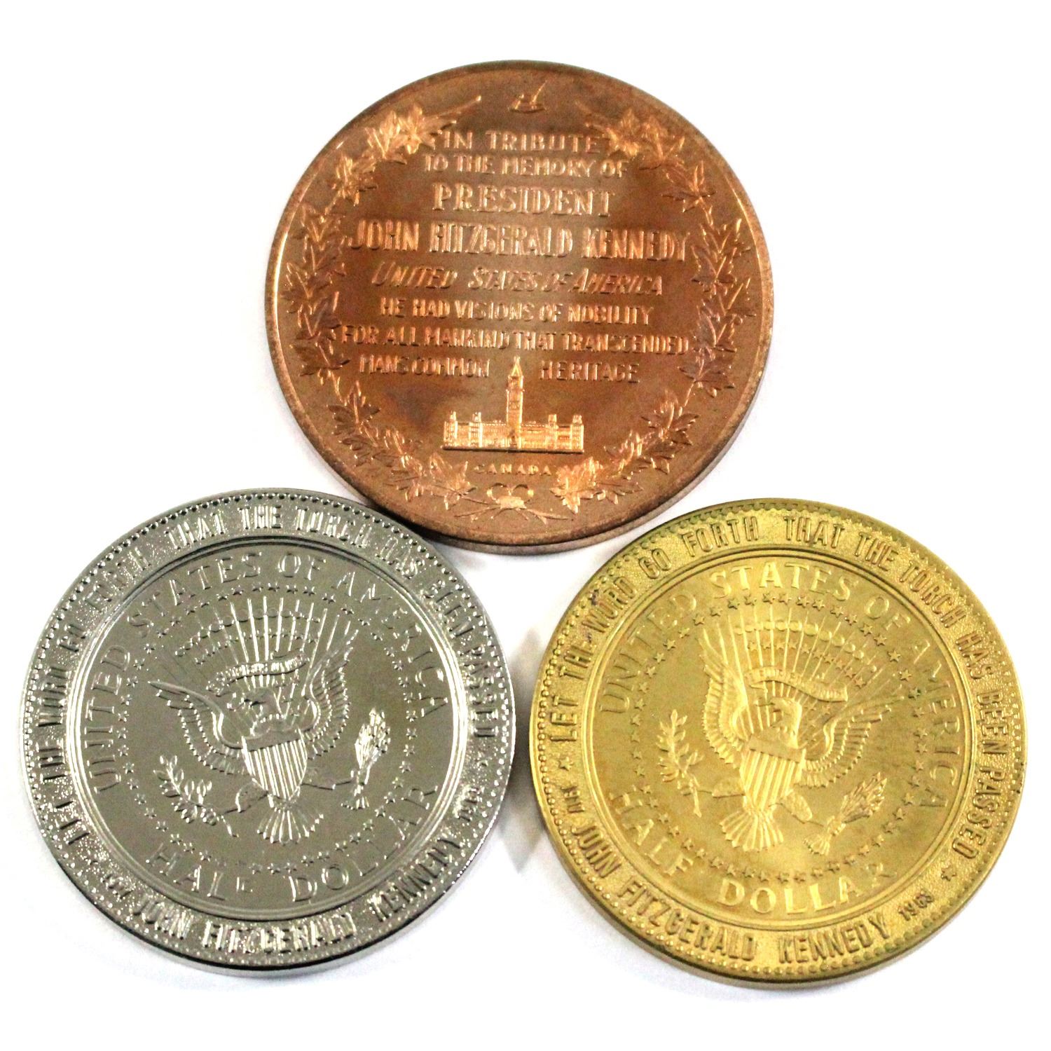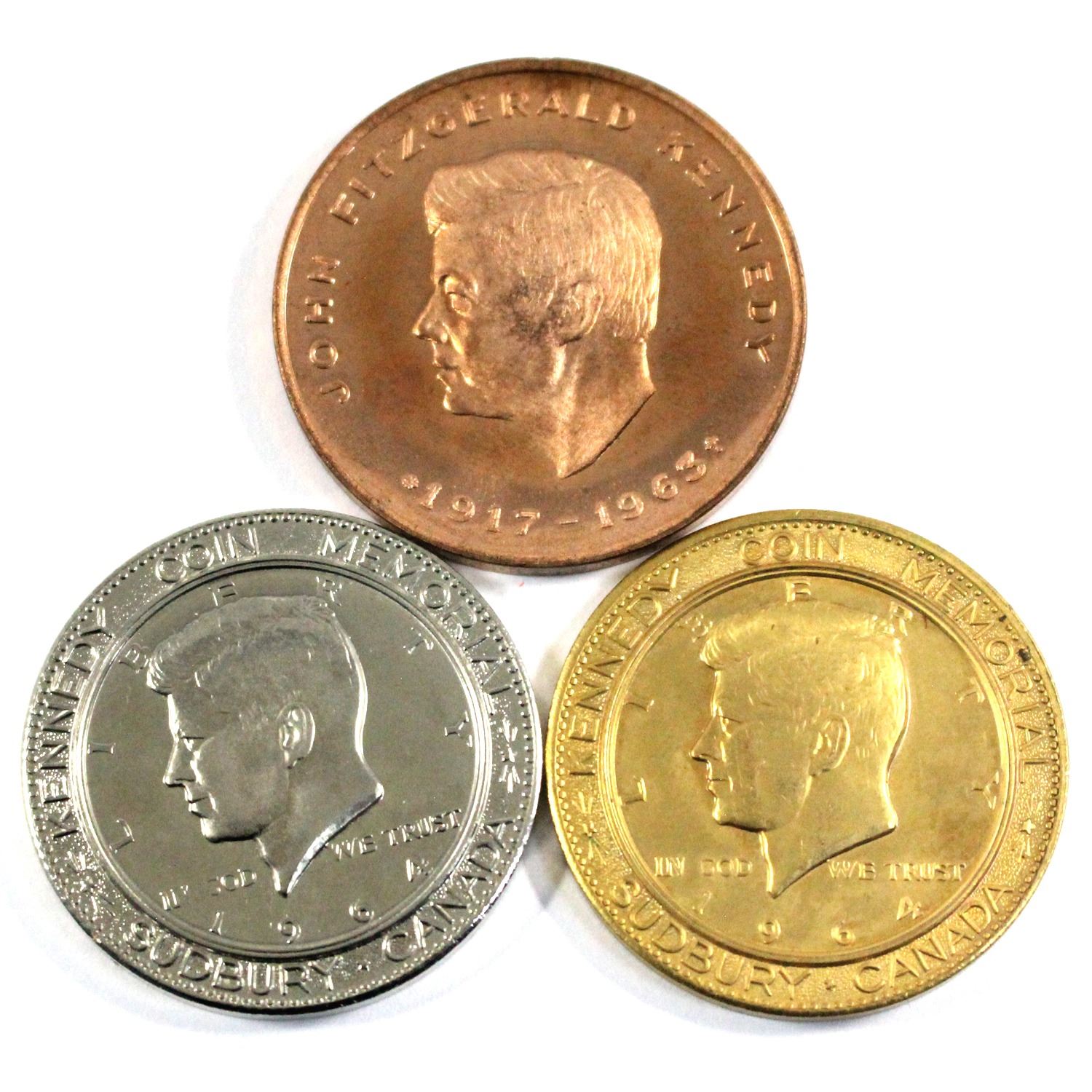 3x Canada John F. Kennedy Commemorative Medallions. You will receive a copper tribute to the memory of JFK & 2x Sudbury Kennedy Coin Memorial design in white metal and brass. 3pcs