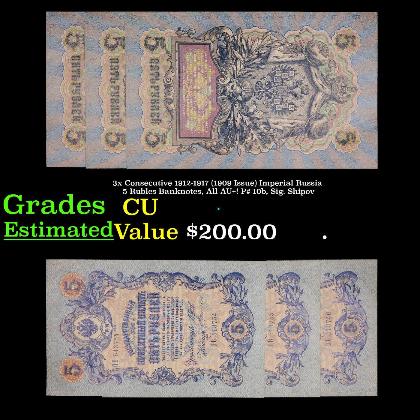3x Consecutive 1912-1917 (1909 Issue) Imperial Russia 5 Rubles Banknotes, All AU+! P# 10b, Sig. Shipov Grades CU.        Up for auction we have a beautiful, ornate Imperial Ruble note from the final decade of the Russian Empire under Tsar Nicholas II, which managed to survive through the Russian Revolution and Civil War. These notes became relatively useless in the early Soviet period, due to hyperinflation and other factors, and many were lost or destroyed.