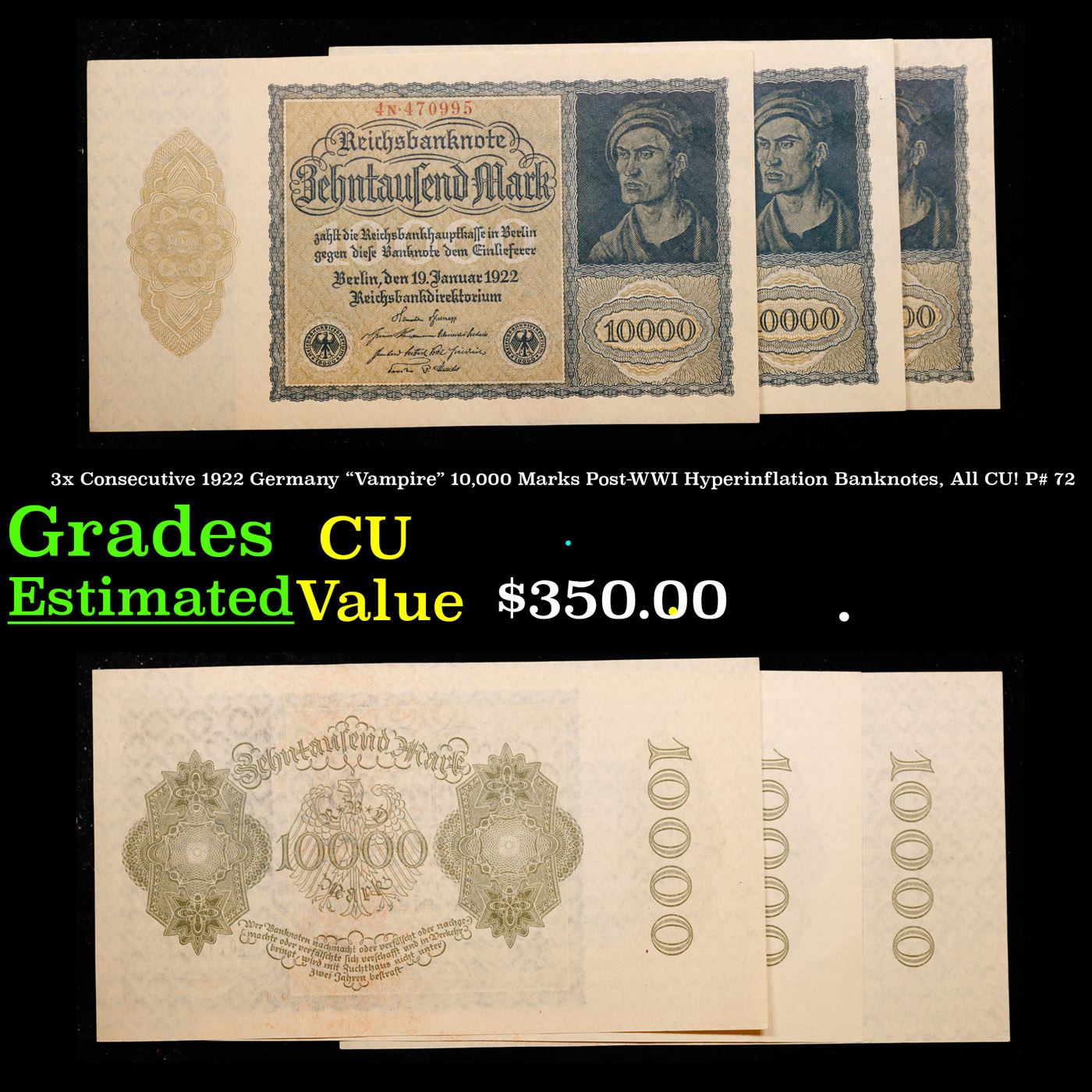 3x Consecutive 1922 Germany "Vampire" 10,000 Marks Post-WWI Hyperinflation Banknotes, All CU! P# 72 Grades CU. Among the many bills issued during the hyperinflation crisis in the post-WWI German Weimar Republic, the "Vampire Note" is a particular standout. It is known as the Vampire Note because when the note's engraver (identity unknown) adapted a portrait by famous German Renaissance painter Albrecht Durer for the note, he made an odd alteration where the neck of the figure looks like a Vampire when the bill is rotated 90 degrees. It takes some imagination to see, but was intentional and meant to represent the anti-French sentiment in WWI Germany -- France was considered to be "sucking the life out of" the country following the signing of the Treaty of Versailles. The Reichsbank noticed this alteration, but did not change it, printing several varieties of the bill with the design and giving credence to the popular anti-French sentiment. There are three varieties, Pick # 70 and 71 differing in the reverse design, and Pick # 72 being a smaller version of Pick # 71.