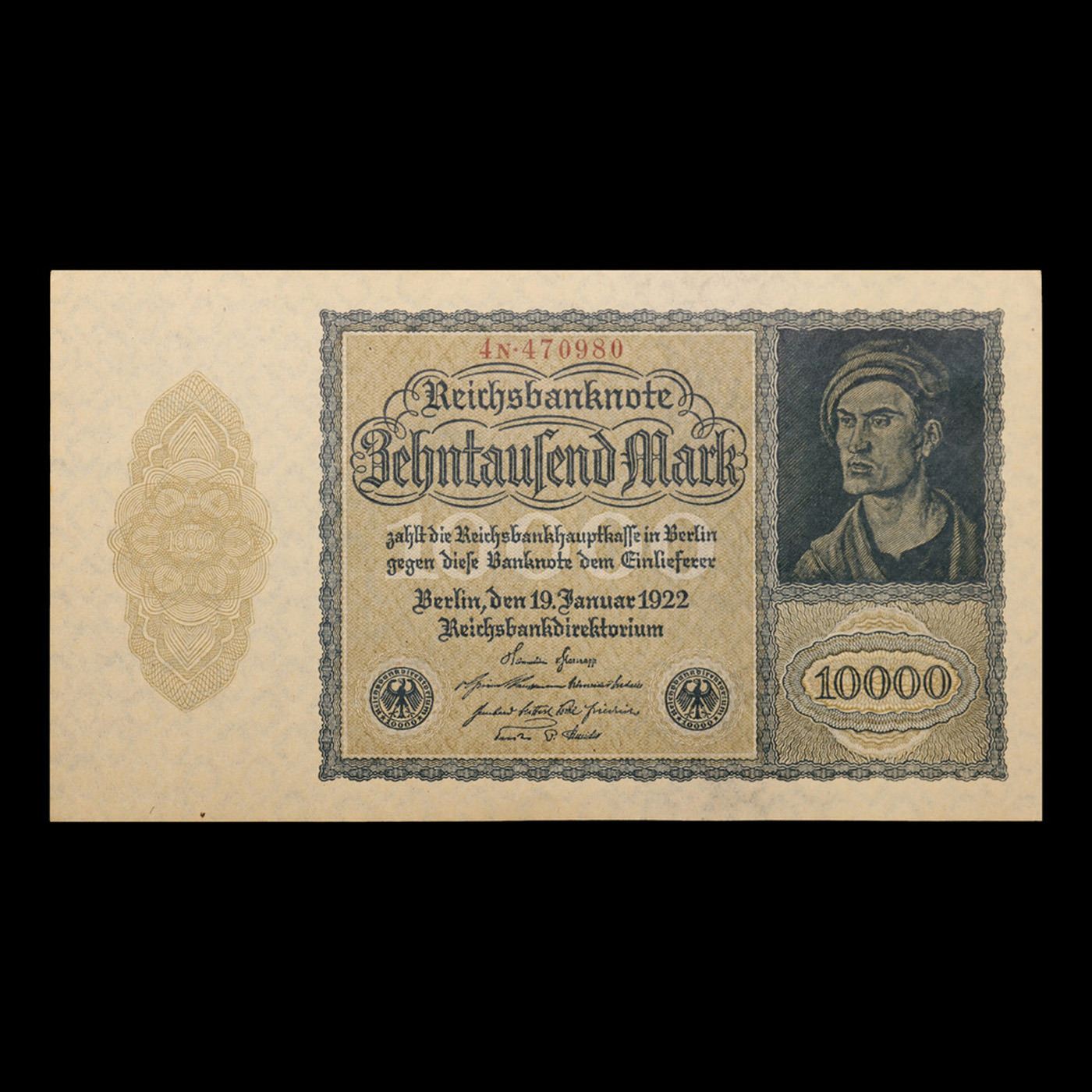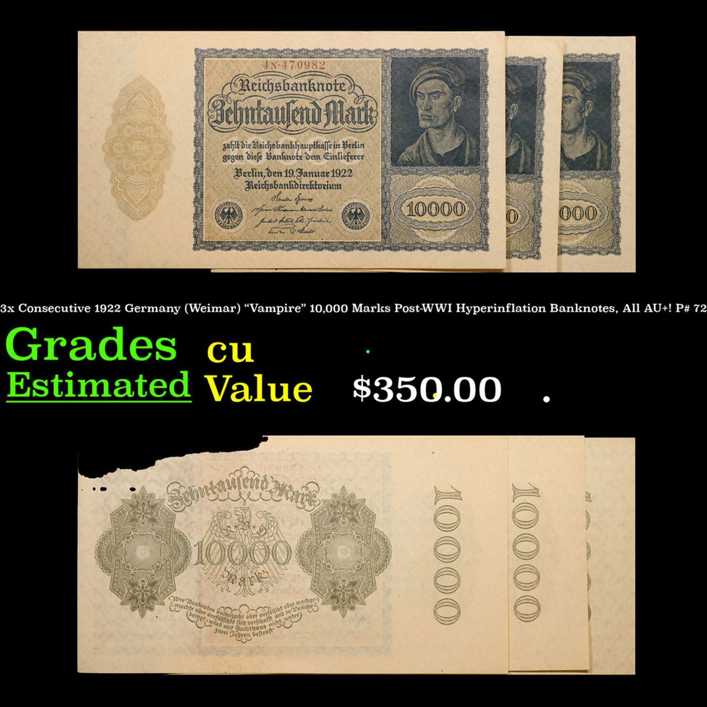 3x Consecutive 1922 Germany (Weimar) "Vampire" 10,000 Marks Post-WWI Hyperinflation Banknotes, All AU+! P# 72 Grades CU. Among the many bills issued during the hyperinflation crisis in the post-WWI German Weimar Republic, the "Vampire Note" is a particular standout. It is known as the Vampire Note because when the note's engraver (identity unknown) adapted a portrait by famous German Renaissance painter Albrecht Durer for the note, he made an odd alteration where the neck of the figure looks like a Vampire when the bill is rotated 90 degrees. It takes some imagination to see, but was intentional and meant to represent the anti-French sentiment in WWI Germany -- France was considered to be "sucking the life out of" the country following the signing of the Treaty of Versailles. The Reichsbank noticed this alteration, but did not change it, printing several varieties of the bill with the design and giving credence to the popular anti-French sentiment. There are three varieties, Pick # 70 and 71 differing in the reverse design, and Pick # 72 being a smaller version of Pick # 71.