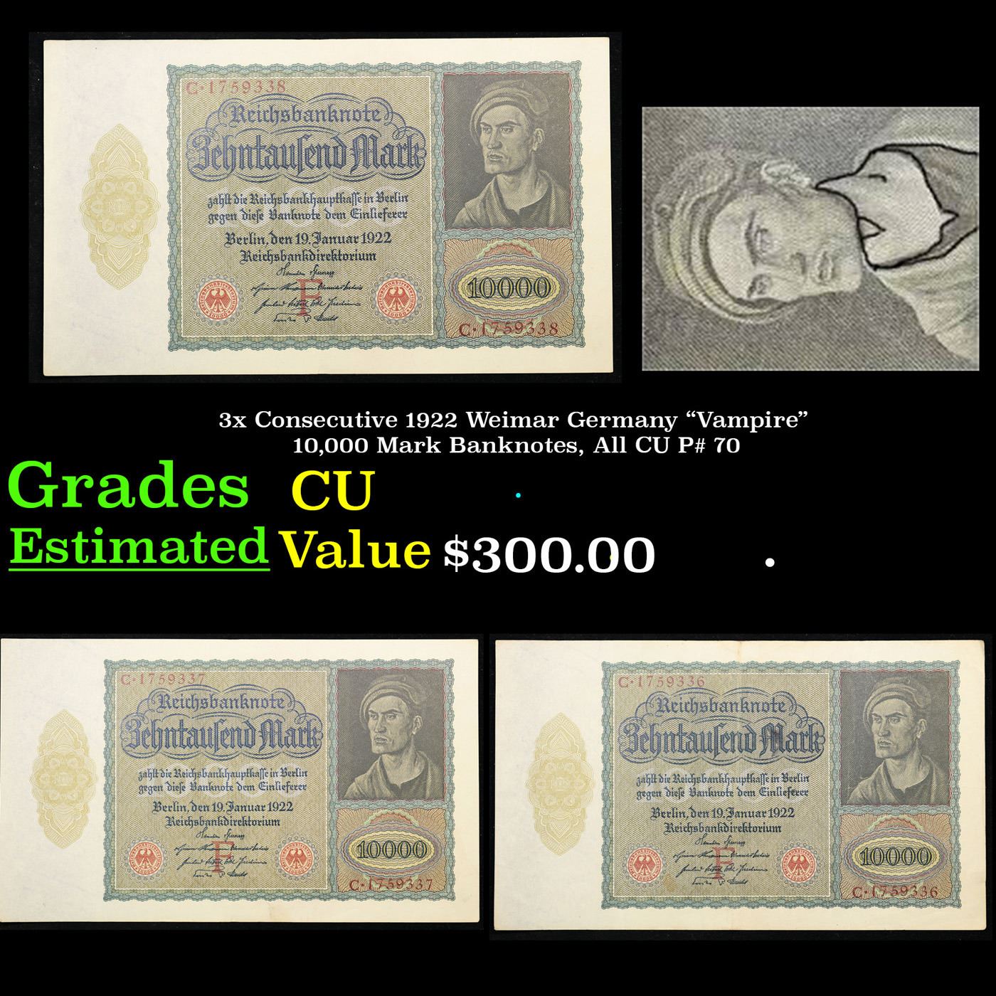 3x Consecutive 1922 Weimar Germany "Vampire" 10,000 Mark Banknotes, All AU+! P# 70 Grades CU. Among the many bills issued during the hyperinflation crisis in the post-WWI German Weimar Republic, the "Vampire Note" is a particular standout. It is known as the Vampire Note because when the note's engraver (identity unknown) adapted a portrait by famous German Renaissance painter Albrecht Durer for the note, he made an odd alteration where the neck of the figure looks like a Vampire when the bill is rotated 90 degrees. It takes some imagination to see, but was intentional and meant to represent the anti-French sentiment in WWI Germany -- France was considered to be "sucking the life out of" the country following the signing of the Treaty of Versailles. The Reichsbank noticed this alteration, but did not change it, printing several varieties of the bill with the design and giving credence to the popular anti-French sentiment. There are three varieties, Pick # 70 and 71 differing in the reverse design, and Pick # 72 being a smaller version of Pick # 71.
