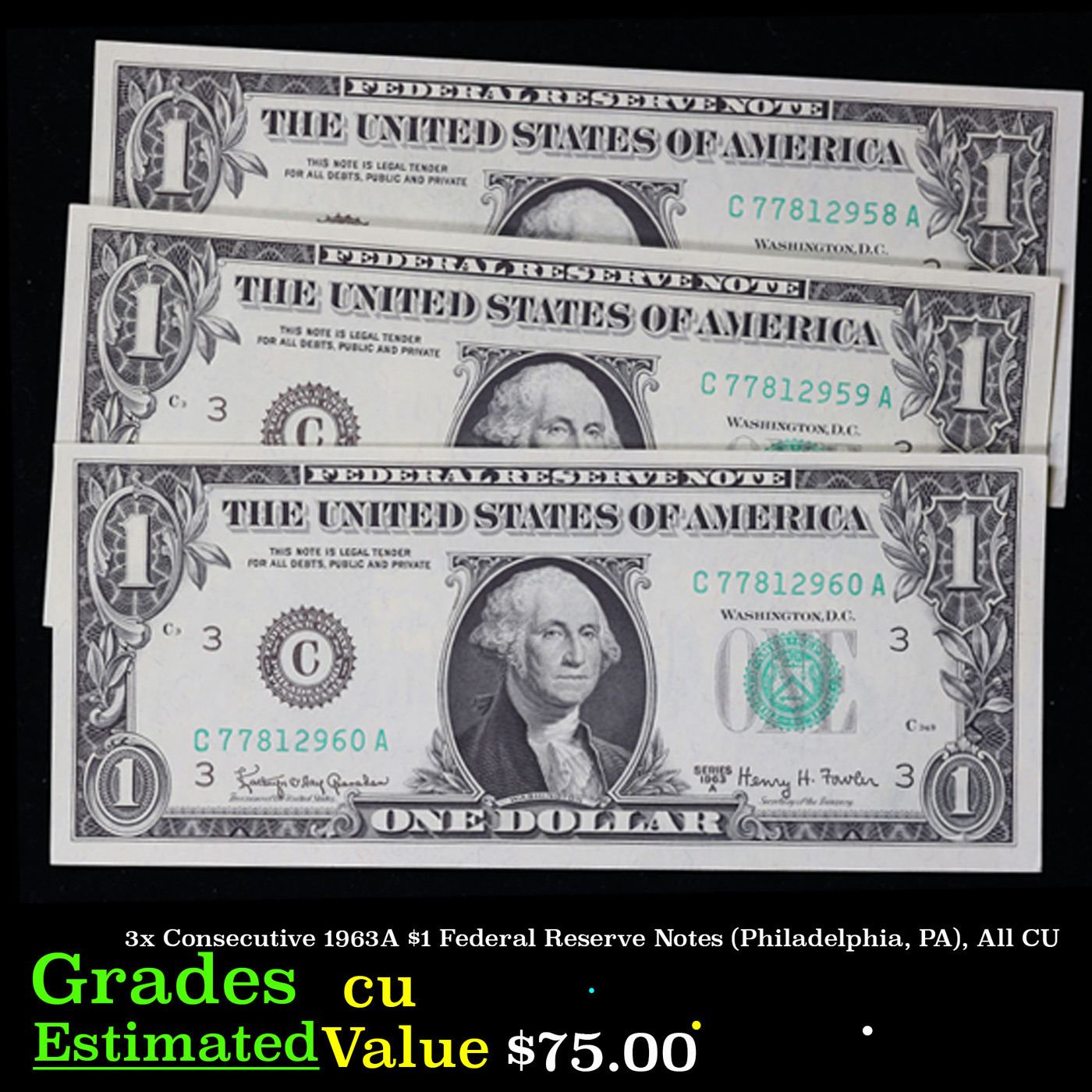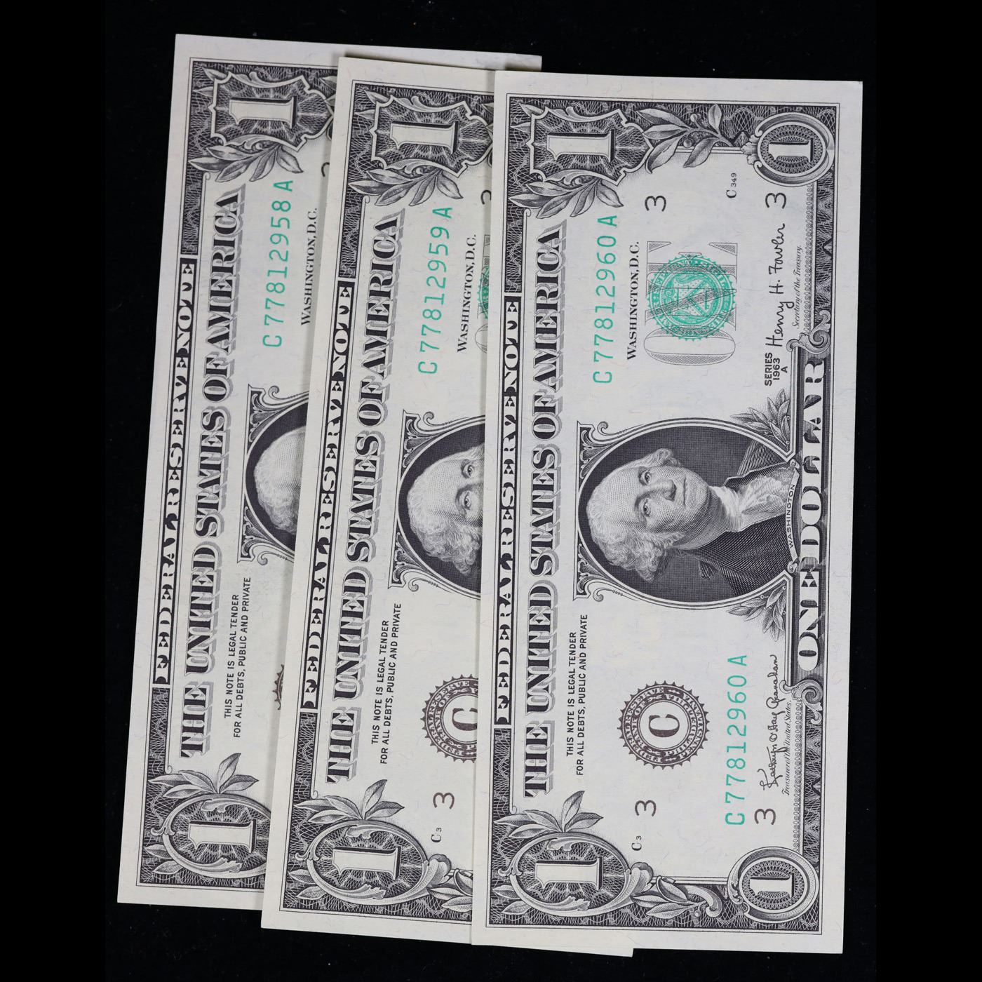3x Consecutive 1963A $1 Federal Reserve Notes (Philadelphia, PA), All CU Grades CU