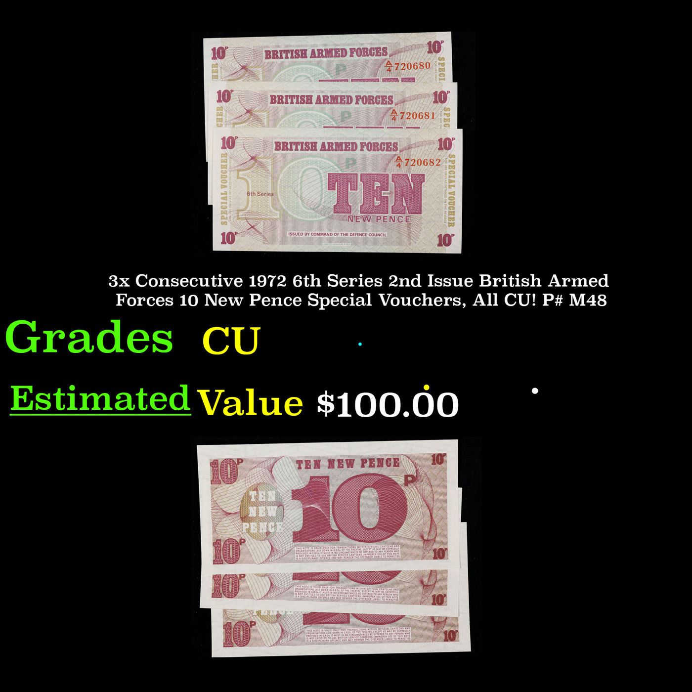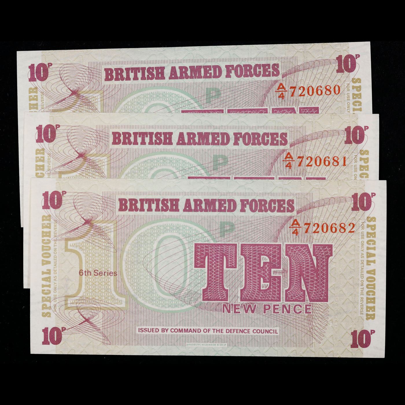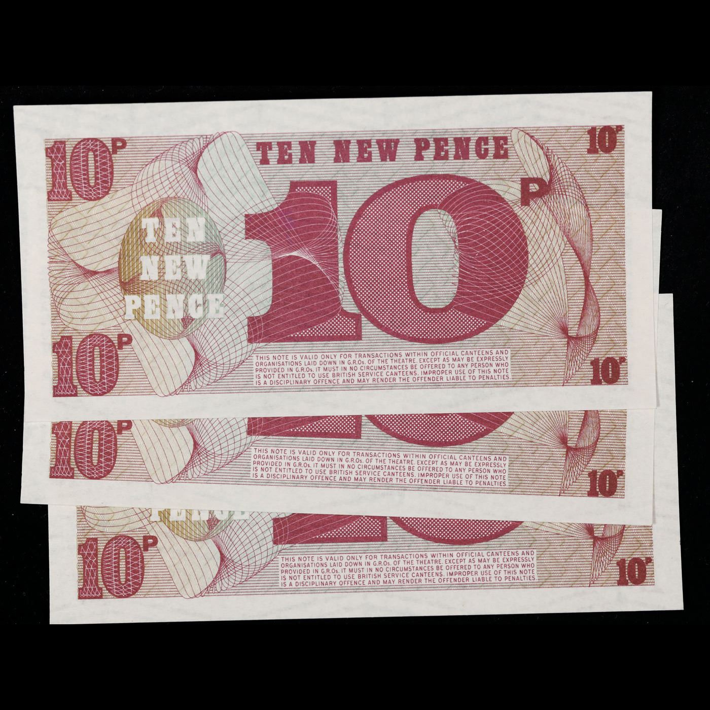 3x Consecutive 1972 6th Series 2nd Issue British Armed Forces 10 New Pence Special Vouchers, All CU! P# M48 Grades CU.