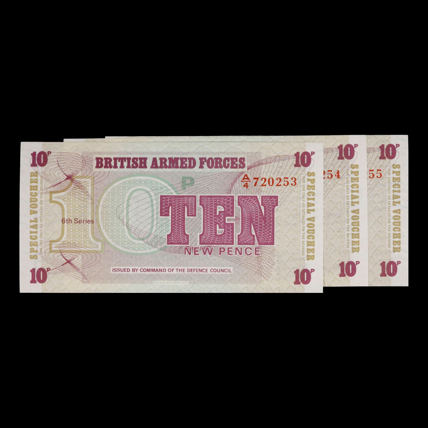 3x Consecutive 1972 6th Series 2nd Issue British Armed Forces 10 New Pence Special Vouchers, All CU! P# M48 Grades CU.
