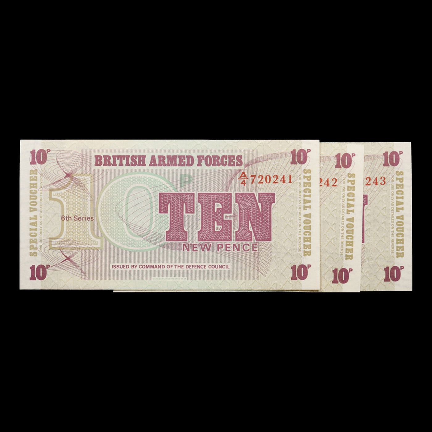 3x Consecutive 1972 6th Series 2nd Issue British Armed Forces 10 New Pence Special Vouchers, All CU!