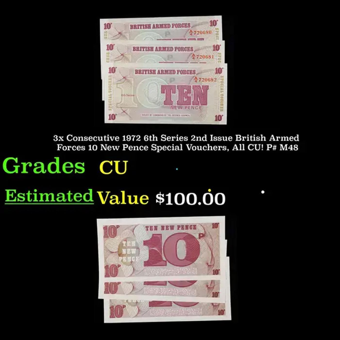 3x Consecutive 1972 6th Series 2nd Issue British Armed Forces 10 New Pence Special Vouchers, All CU! P# M48 Grades CU.