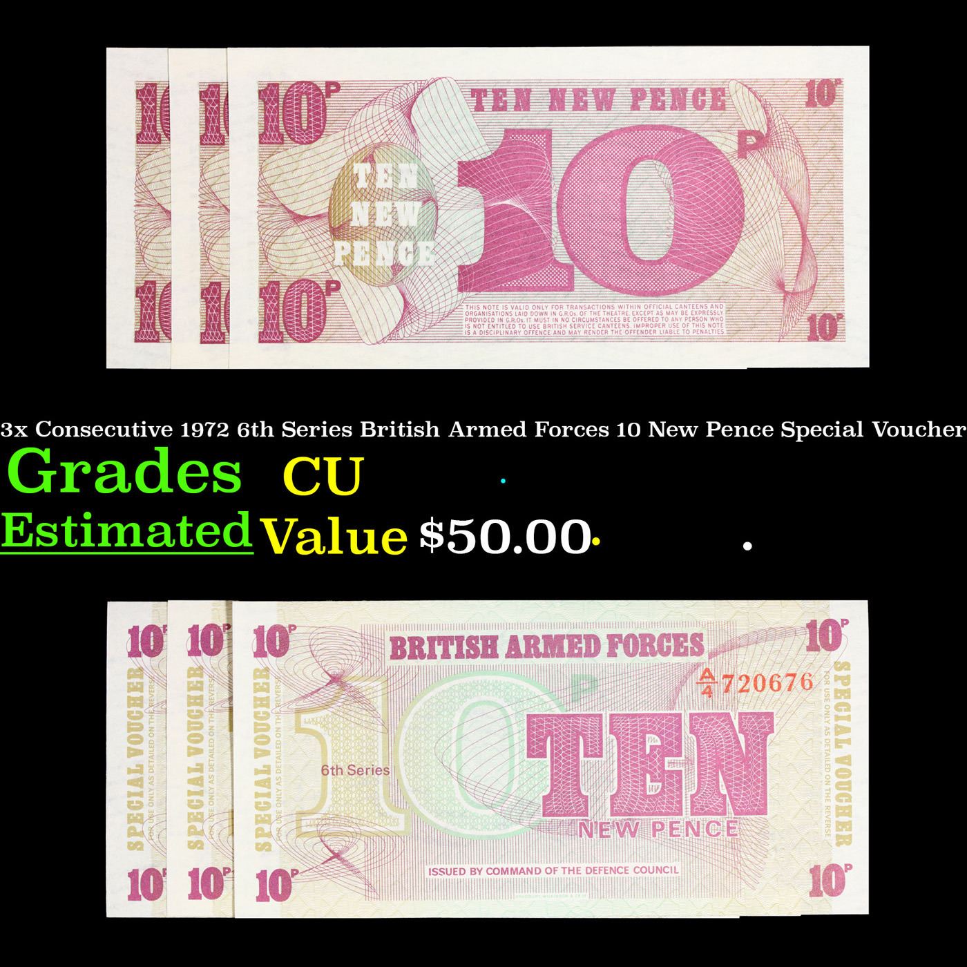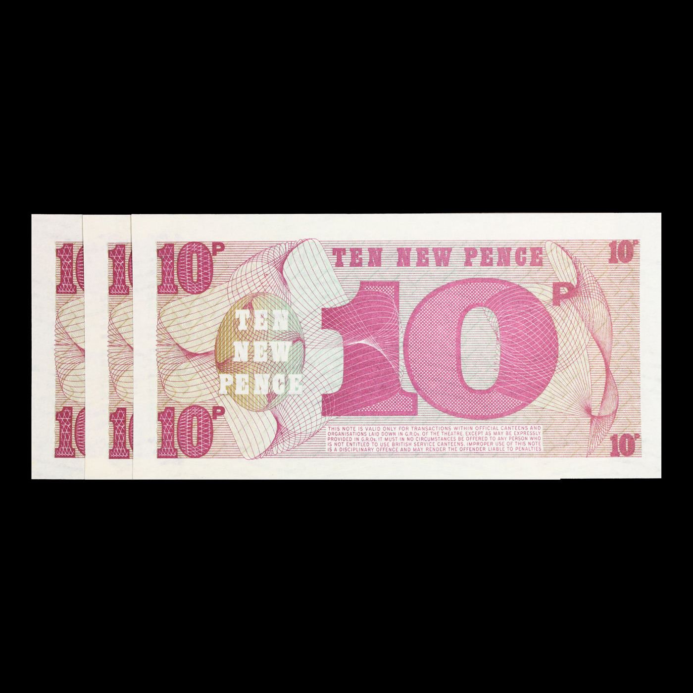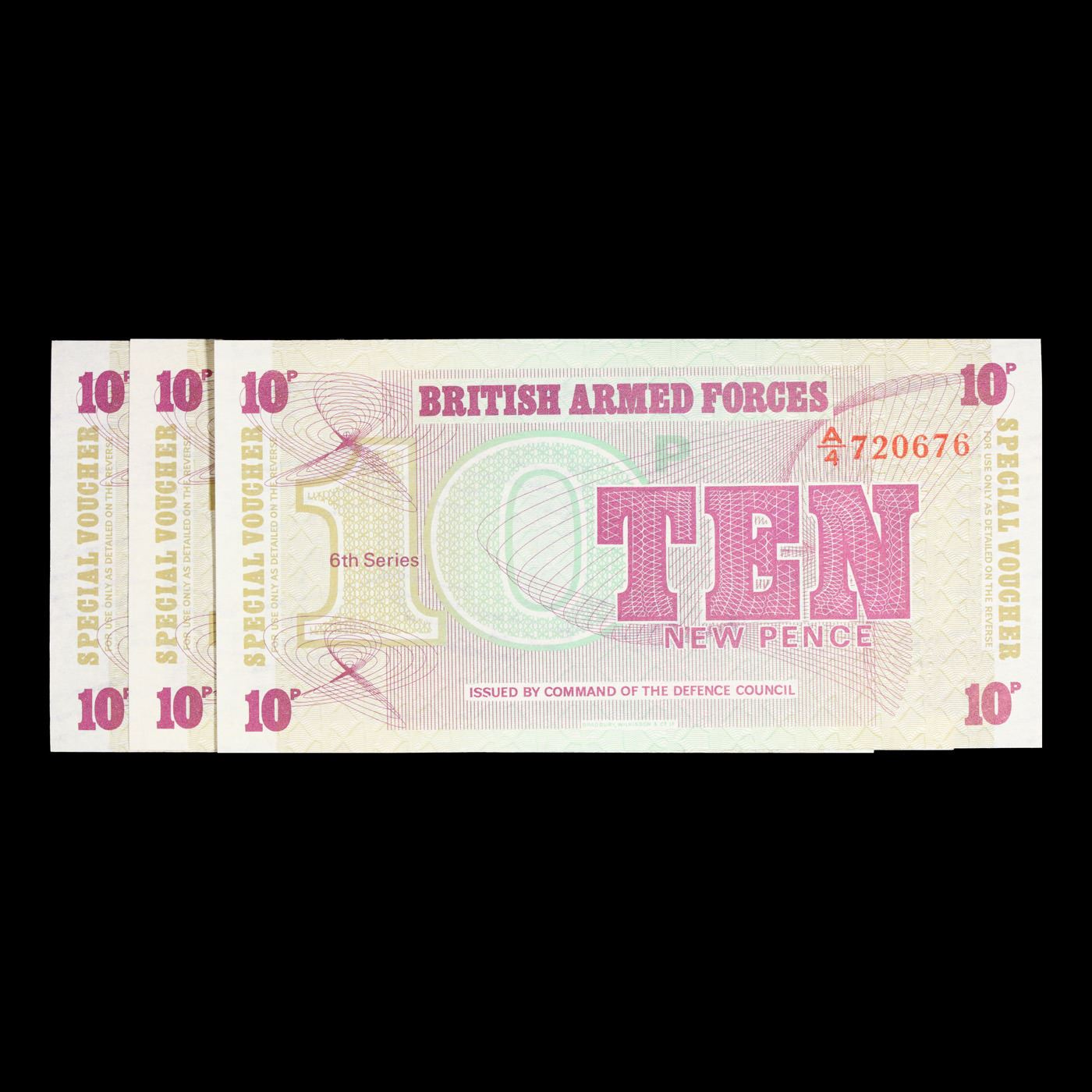 3x Consecutive 1972 6th Series British Armed Forces 10 New Pence Special Voucher Grades CU.