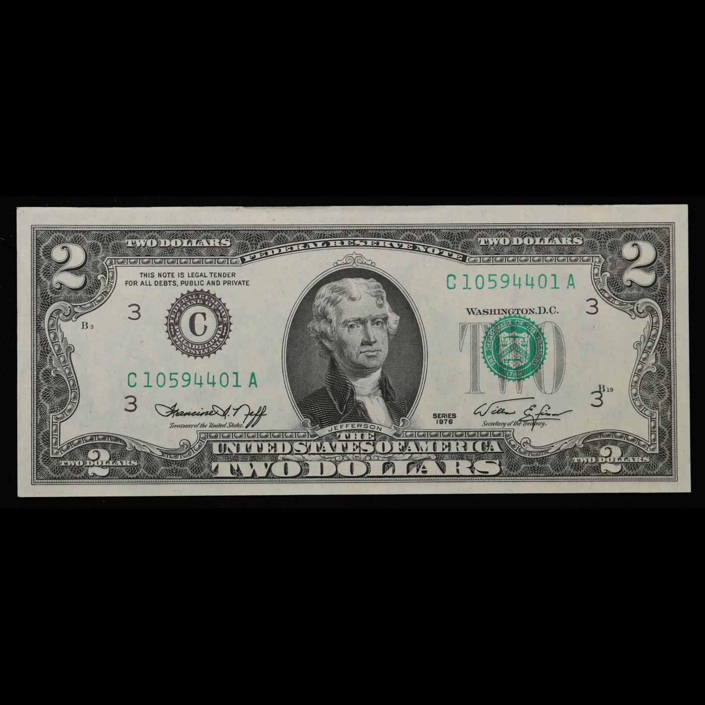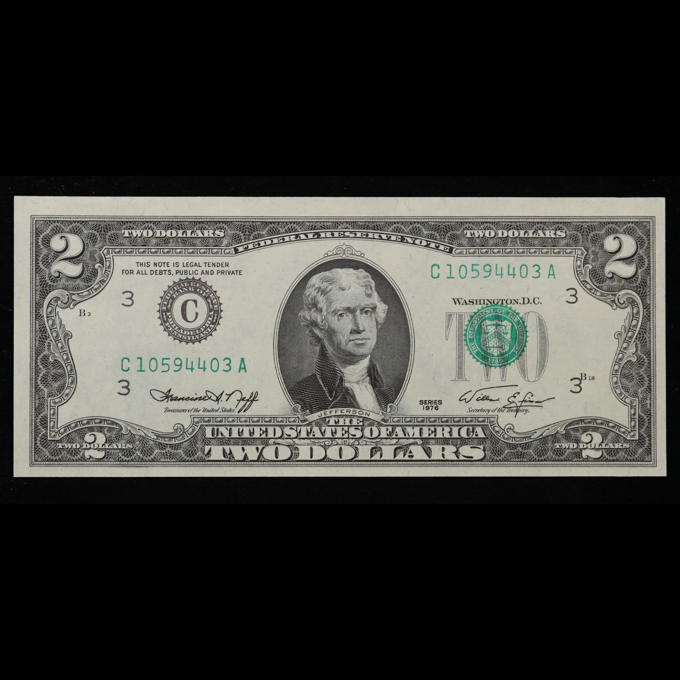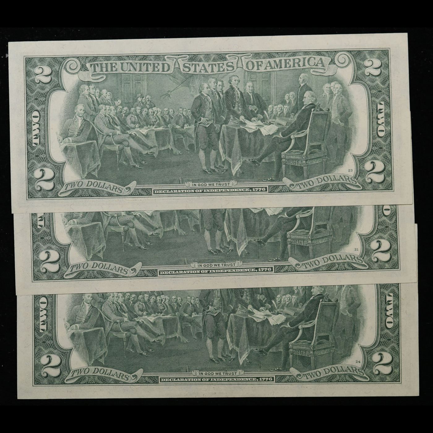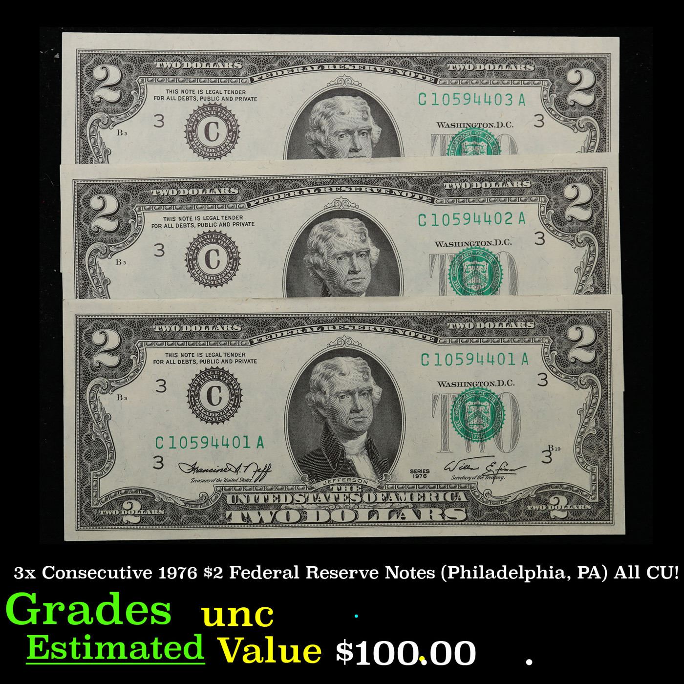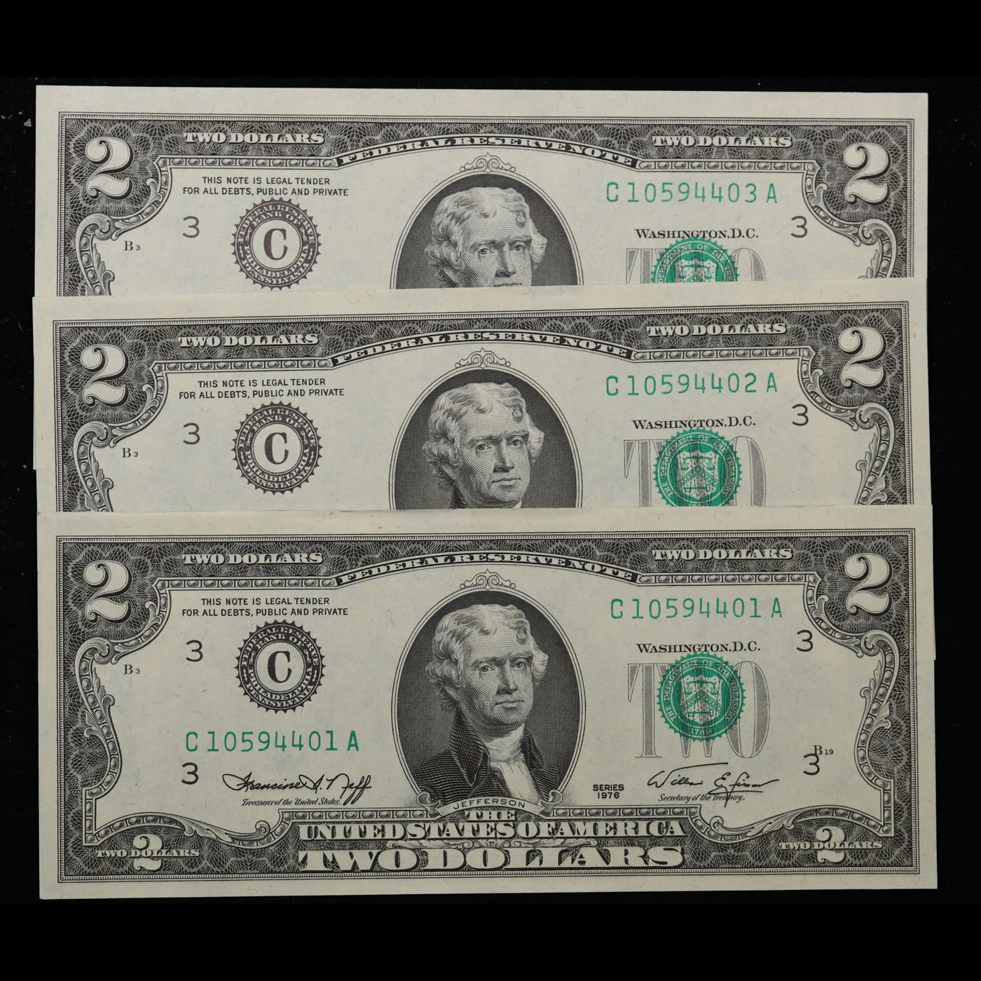 3x Consecutive 1976 $2 Federal Reserve Notes (Philadelphia, PA) All CU! Grades Brilliant Uncirculated.