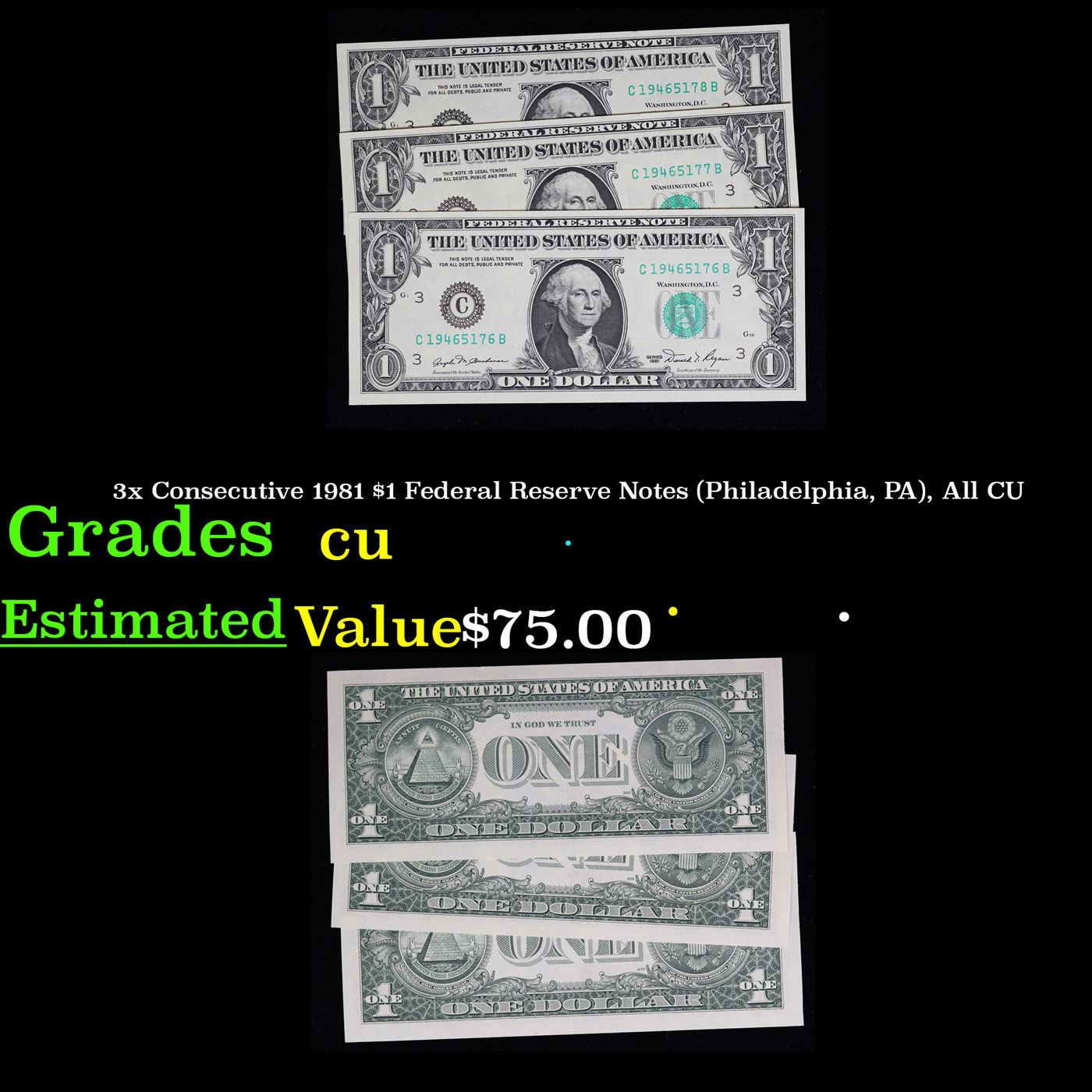 3x Consecutive 1981 $1 Federal Reserve Notes (Philadelphia, PA), All CU Grades CU
