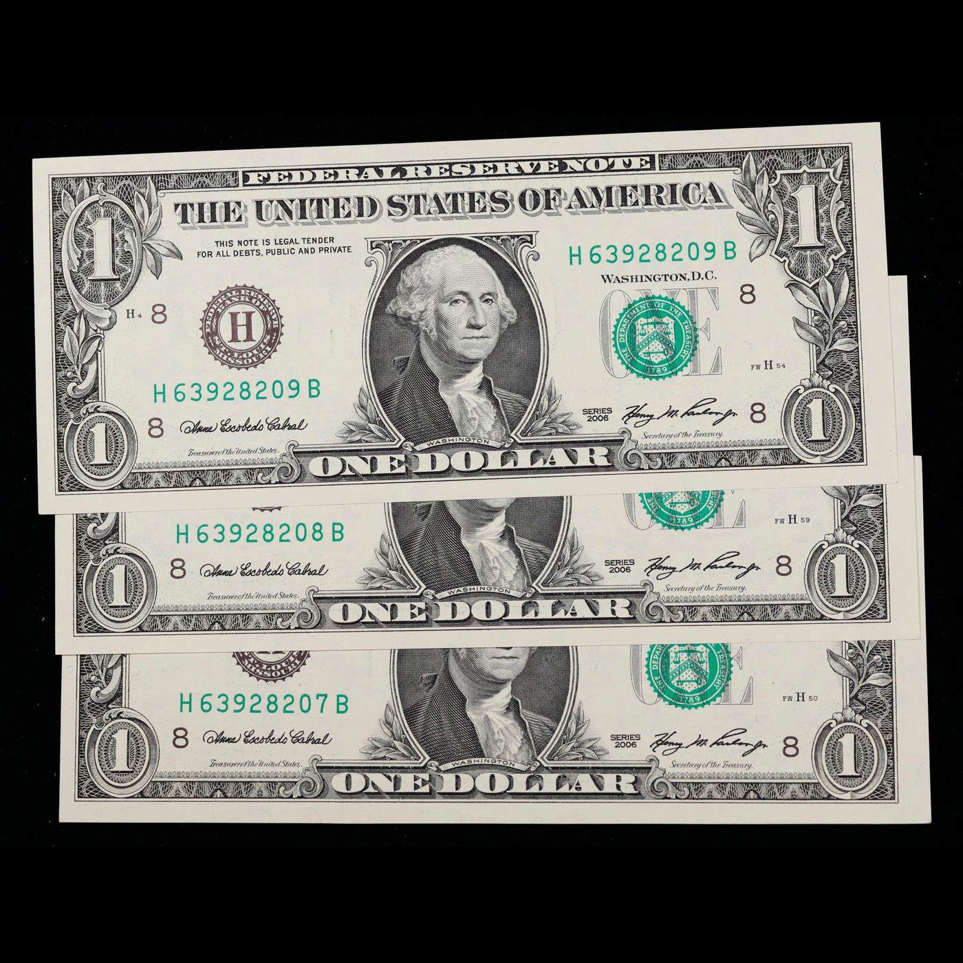 3x Consecutive 2006 $1 Federal Reserve Notes (St. Louis, MO), All CU Grades CU.