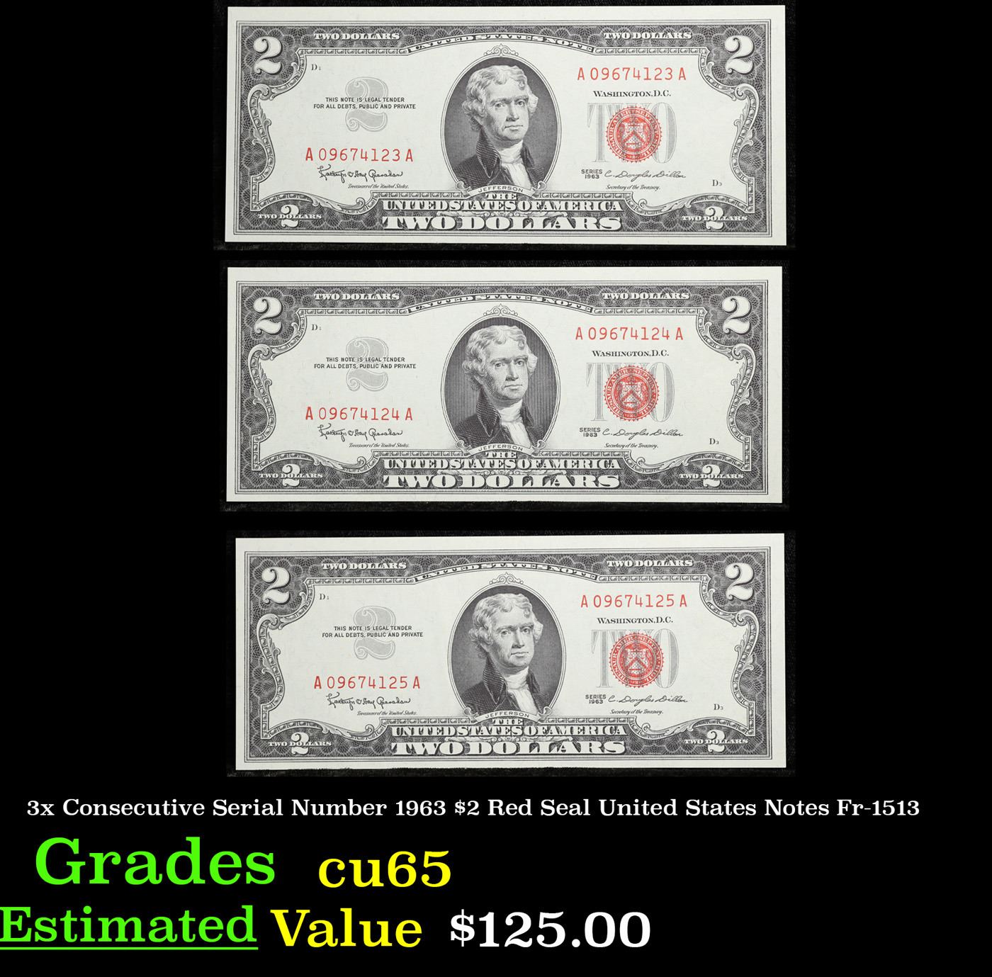 3x Consecutive Serial Number 1963 $2 Red Seal United States Notes Fr-1513 Grades Gem CU.