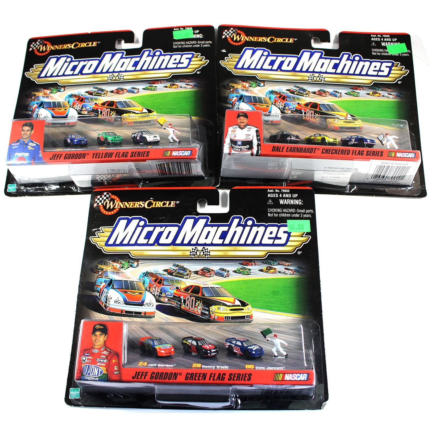 3x Nascar Winners Circle-3-piece Micro Machines Collectible Sets. INCLUDES: Jeff Gordon Yellow Flag Series (#24-Jeff Gordon, 318-Bobby Labonte, #2 Rusy Wallace), Jeff Gordon Green Flag Series (#24-Jeff Gordon, #28-Kenny Irwin, & #88-Dale Jarrett), & Dale Earnhardt Checkered Flag Series (#3-Dale Earnhardt, #1-Steve Park #3-Dale Earnhardt Jr). Yellow Flag Series packaging dented on right side. 3pcs.