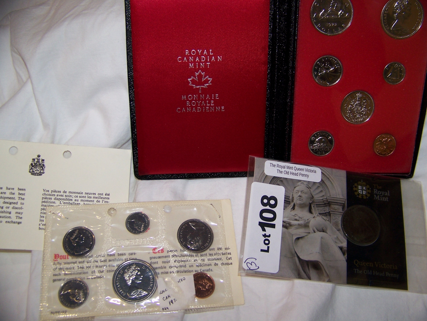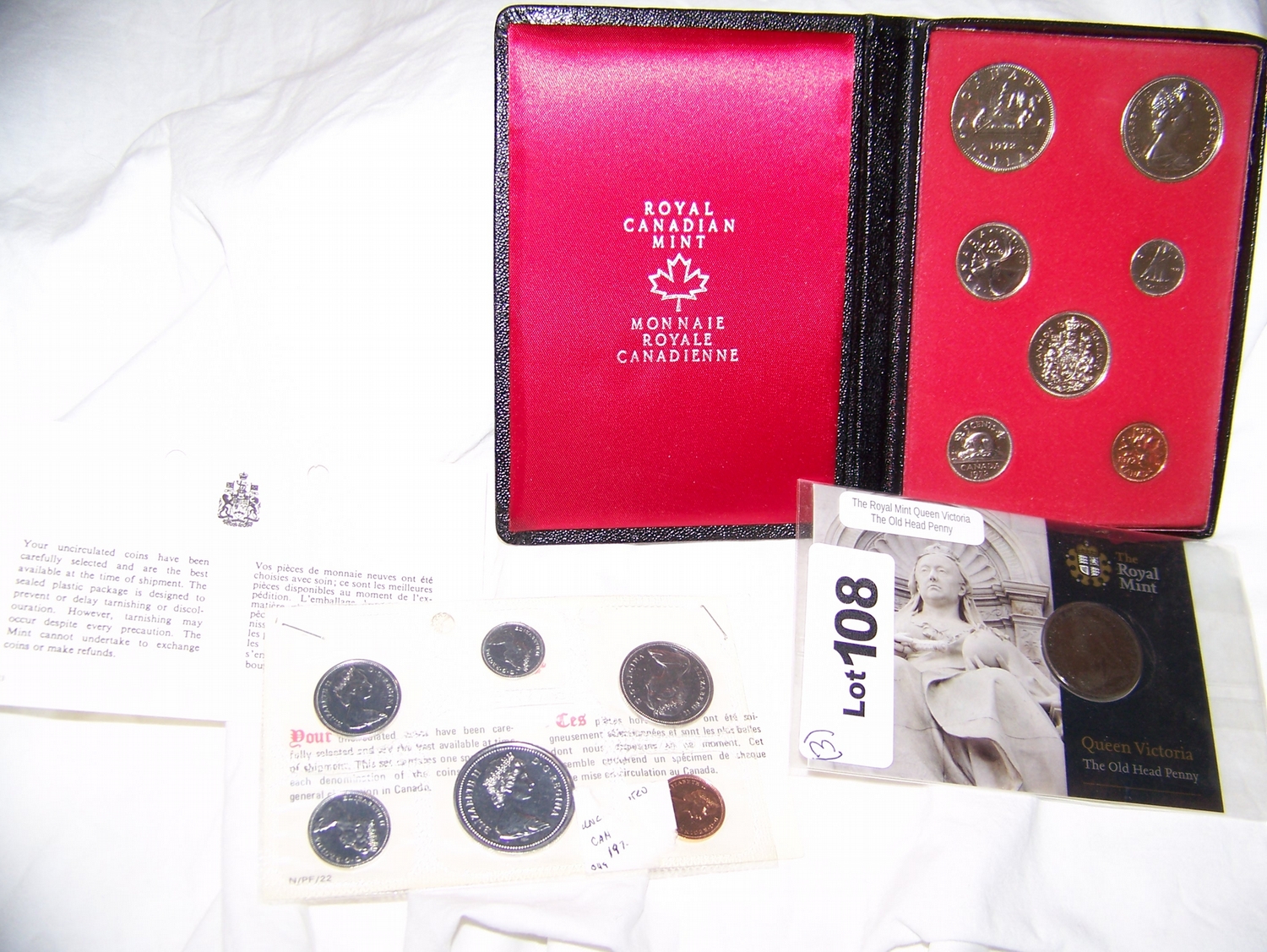 (3x$) ROYAL MINT QUEEN VICTORIA OLD HEAD PENNY,1975 ROYAL CANADIAN UNC MINT SET (6 COINS) &1972 CANADIAN PROOF SET (7 COINS)