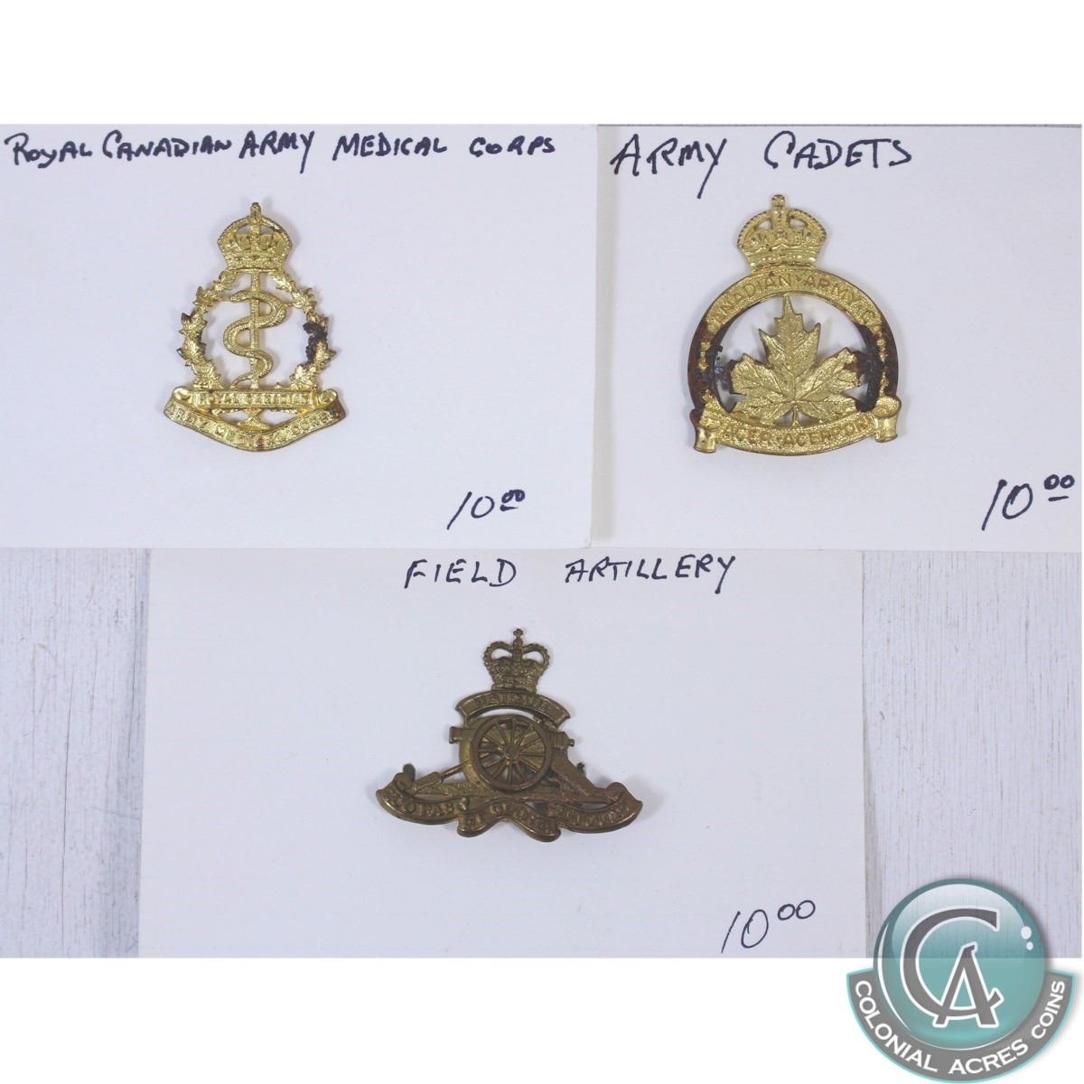 3x Royal Canadian Army Badges. You will receive the following: Medical Corps (discoloured), Field Artillery and Army Cadets (discoloured). 3pcs