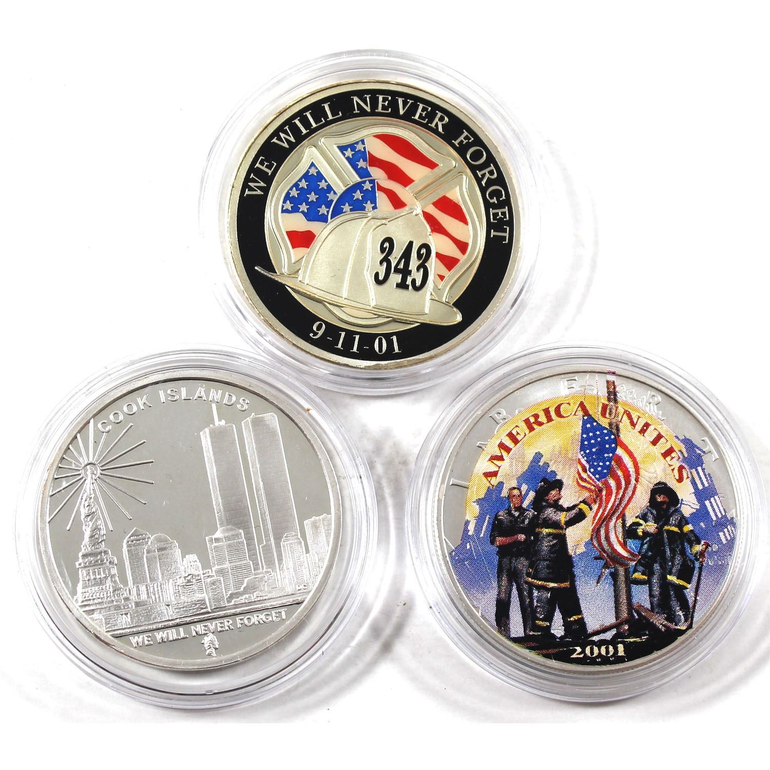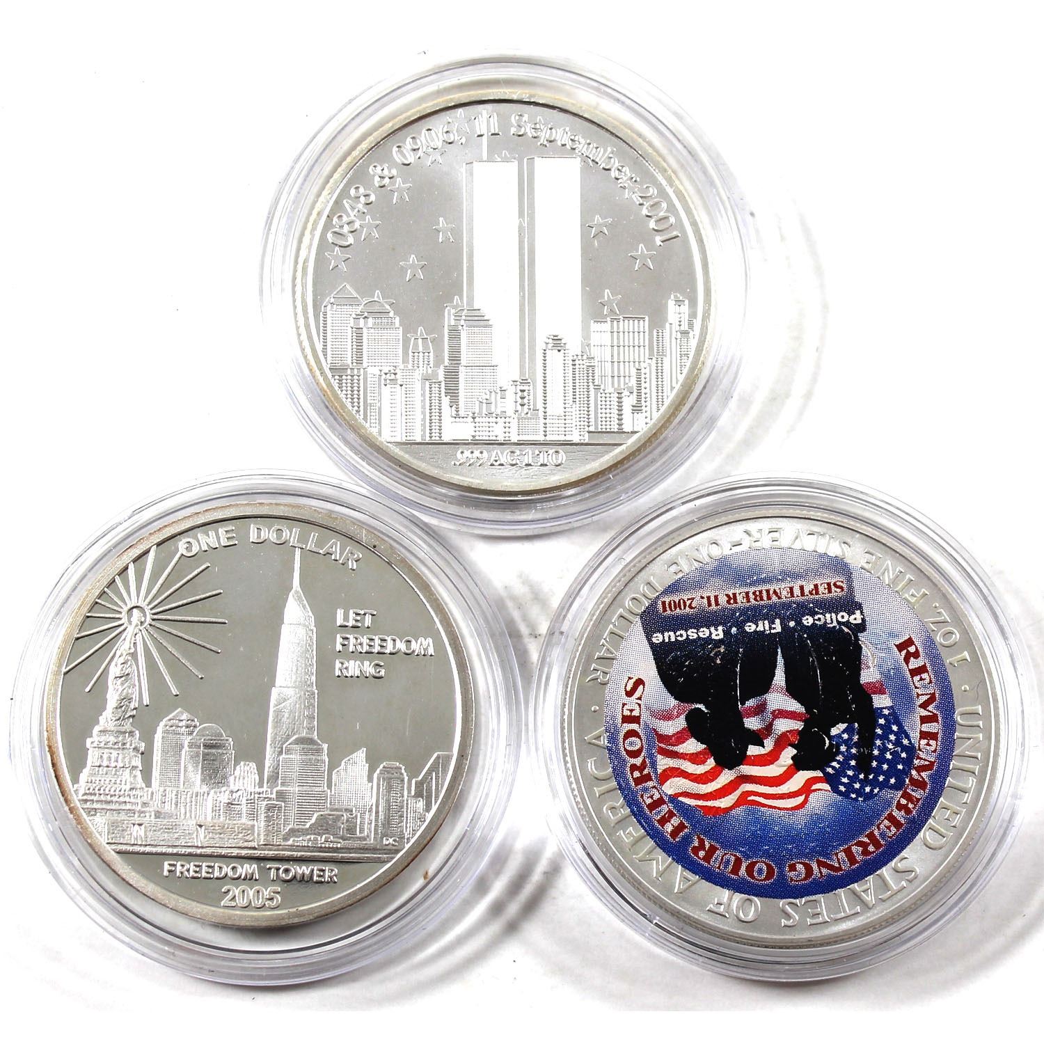 3x September 11, 2001 Commemorative 1oz .999 Fine Silver Rounds of Different Designs in Capsules. 2 of the rounds have been colourized. 3pcs (TAX Exempt)