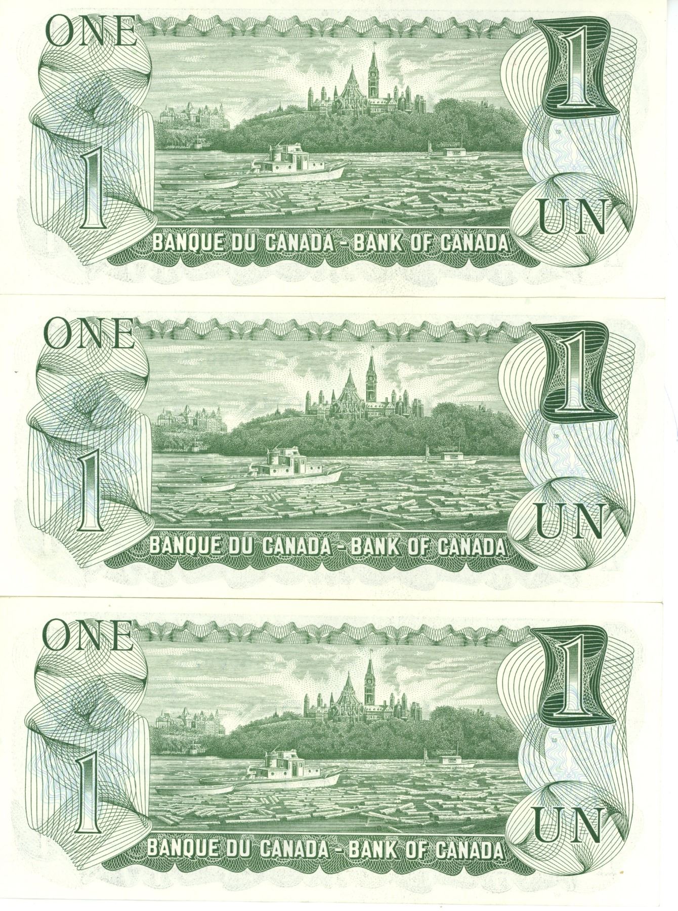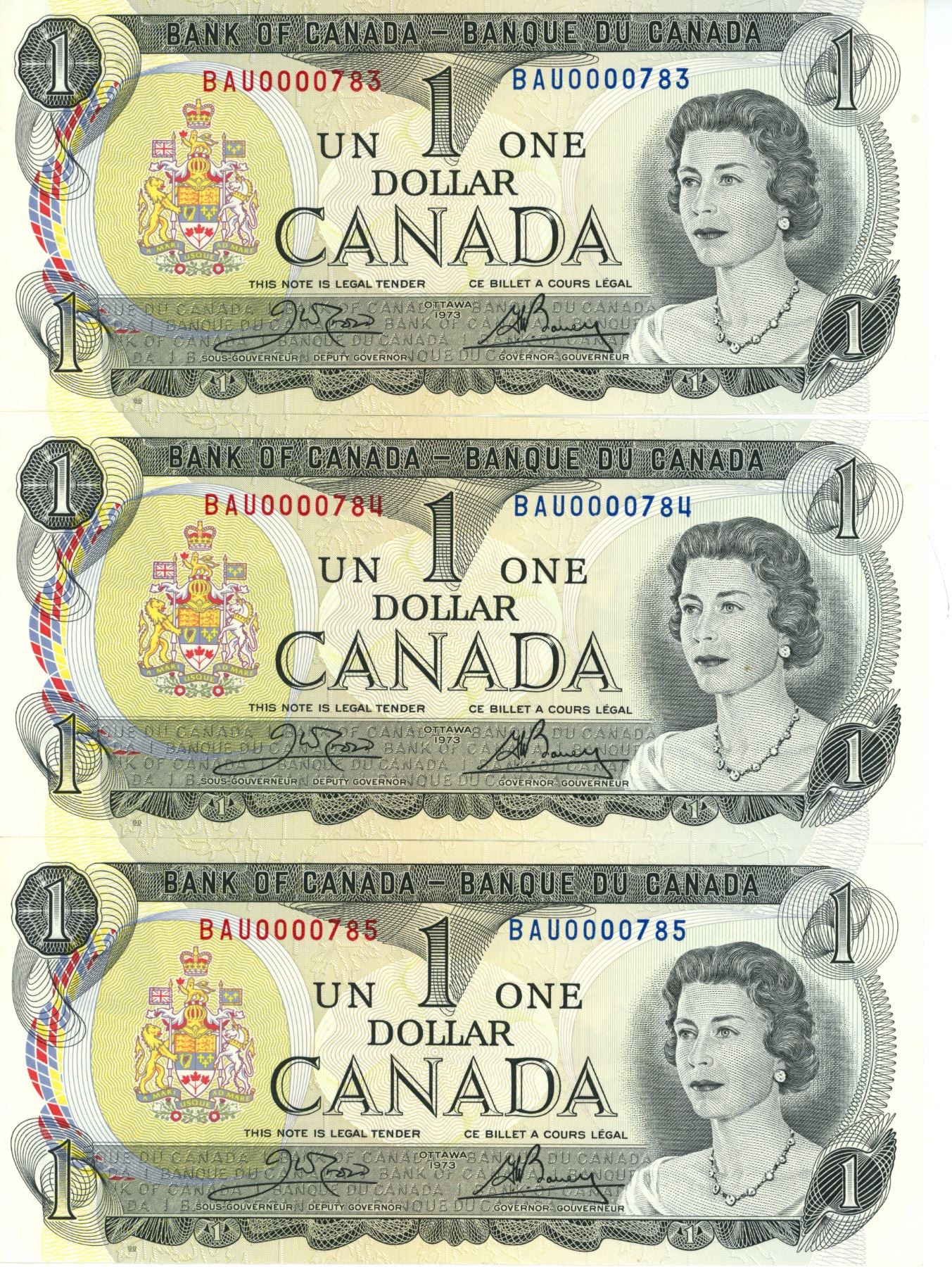 3x Sequential 1973 Canadian $1 Bills - Low Serial #