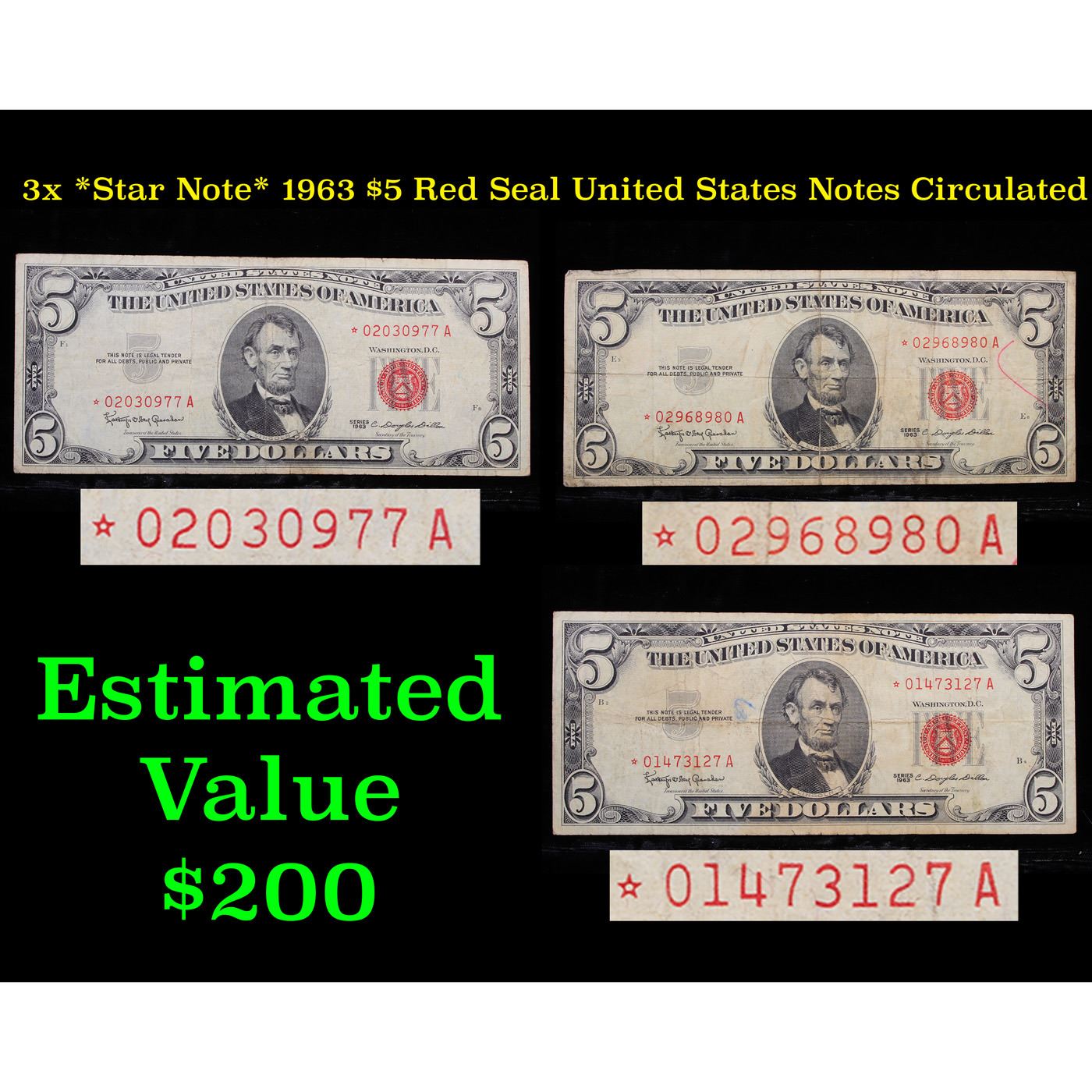 3x *Star Note* 1963 $5 Red Seal United States Notes Circulated Grades.
