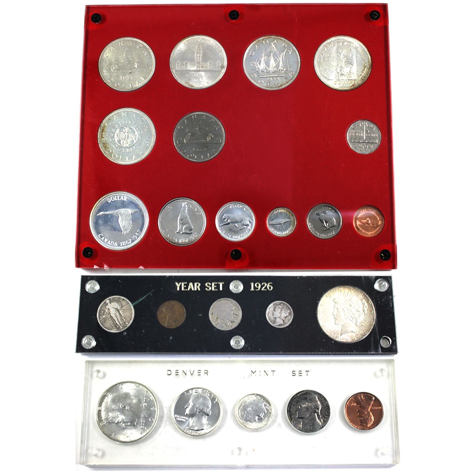 Lot of 3x Coin Sets in Hard Plastic. Lot Includes: 1926 USA Year Set; 1964 D USA Uncirculated Set; & 1935-1968 Canada 13-Coin Collection in Red Display Case. Coins contain natural toning. 3pcs.