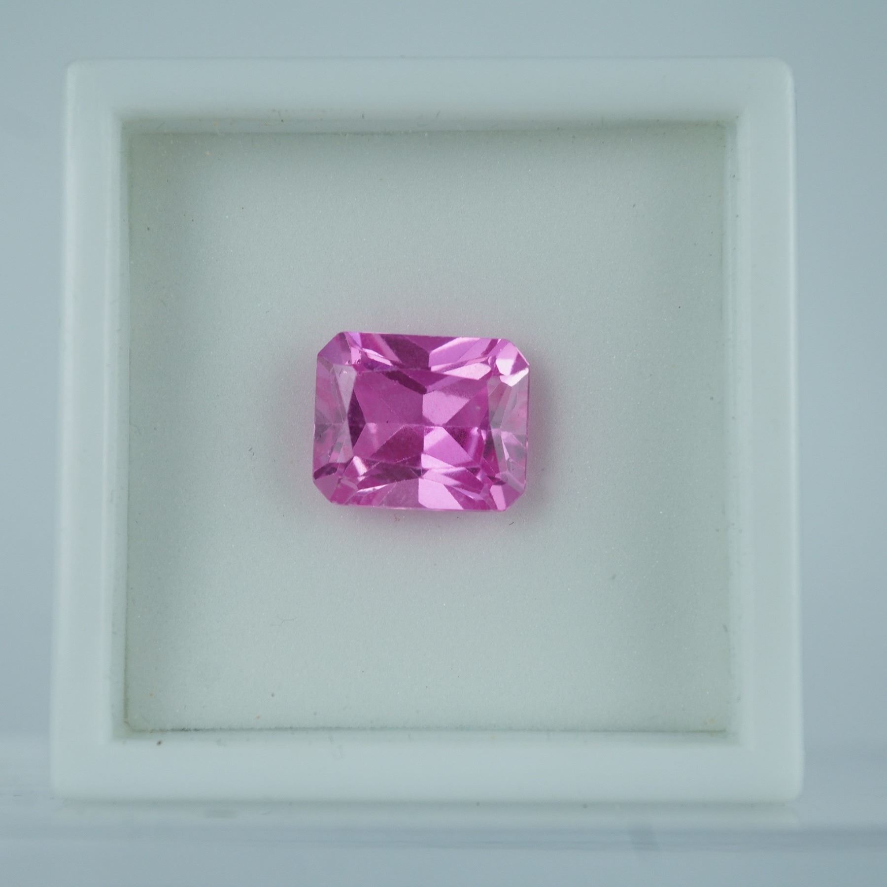 Lab-created pink sapphire in a vibrant emerald cut, showcasing excellent clarity and brilliance. This eye-catching gem offers the beauty of natural sapphire at an accessible price, perfect for bold jewelry designs. Includes protective display case.