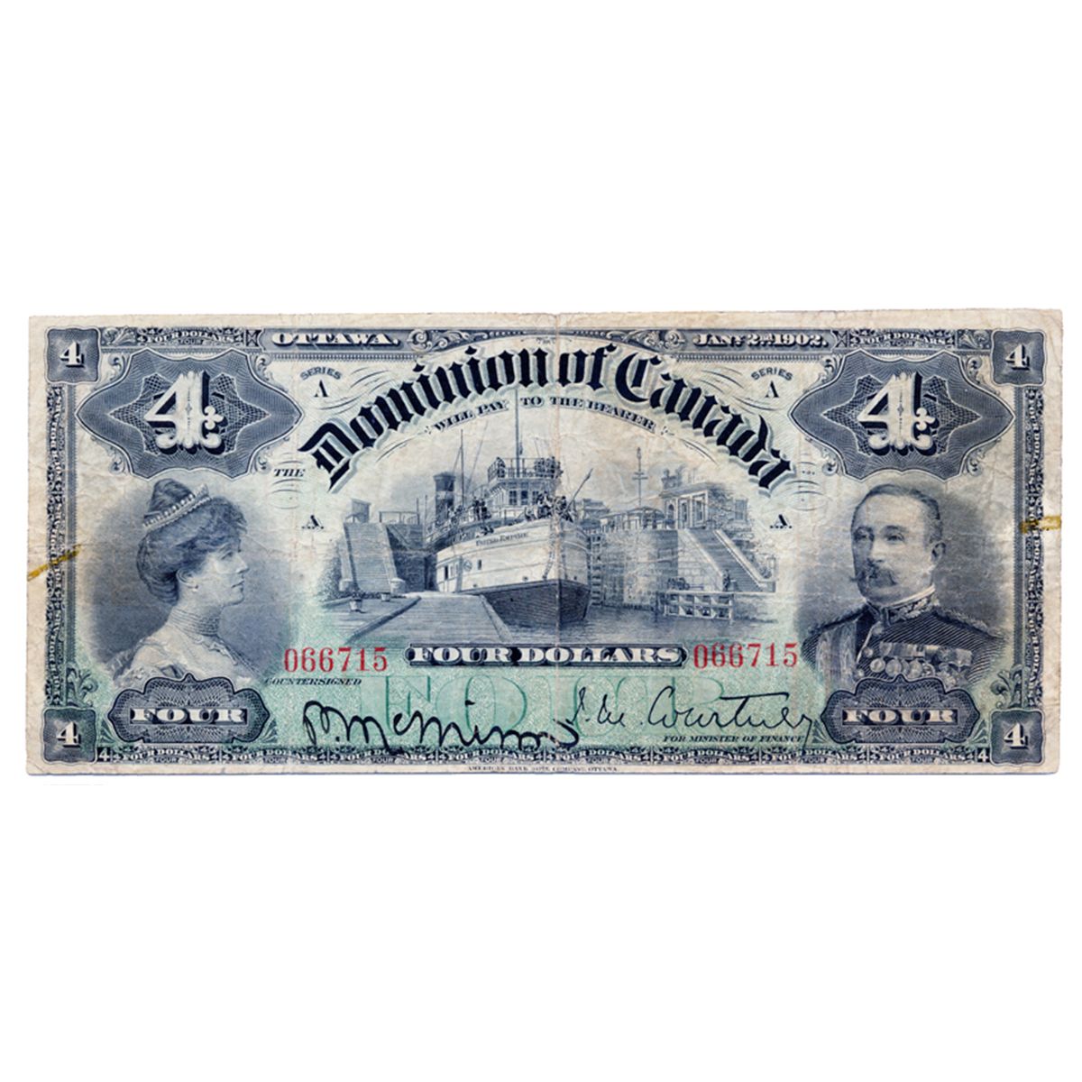 $4.00. Jan. 2, 1902. DC-17a. No. 066715/A. PCGS graded Apparaent Fine-15. Mounting remnants on face at left and right ends.