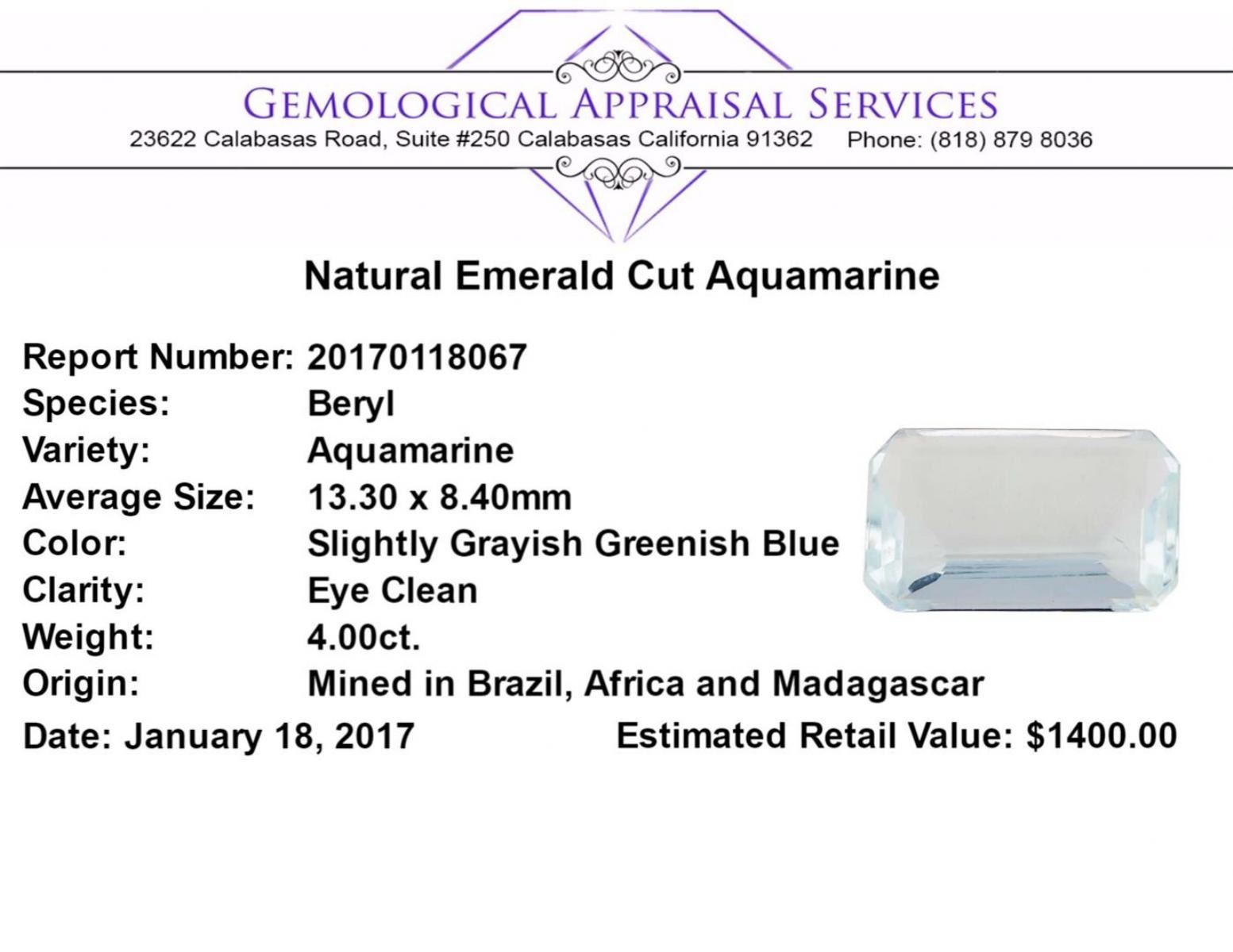 One natural emerald cut aquamarine with an exact weight of 4.00ct., clarity is eye clean, slightly grayish greenish blue. Gemological Appraisals Services estimates the retail value at $1400 GAS Appraised.