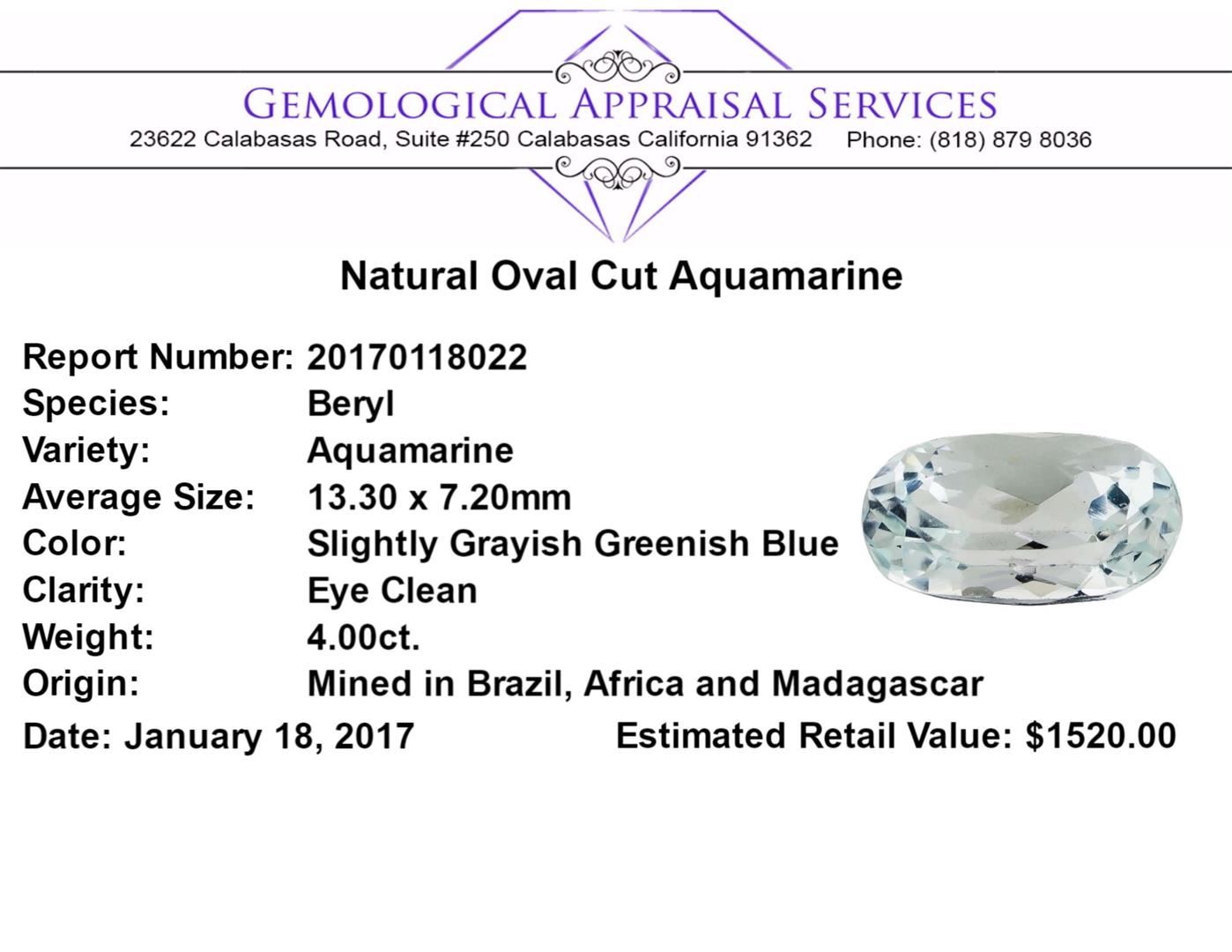 One natural oval cut aquamarine with an exact weight of 4.00ct., clarity is eye clean, slightly grayish greenish blue. Gemological Appraisals Services estimates the retail value at $1520 GAS Appraised.