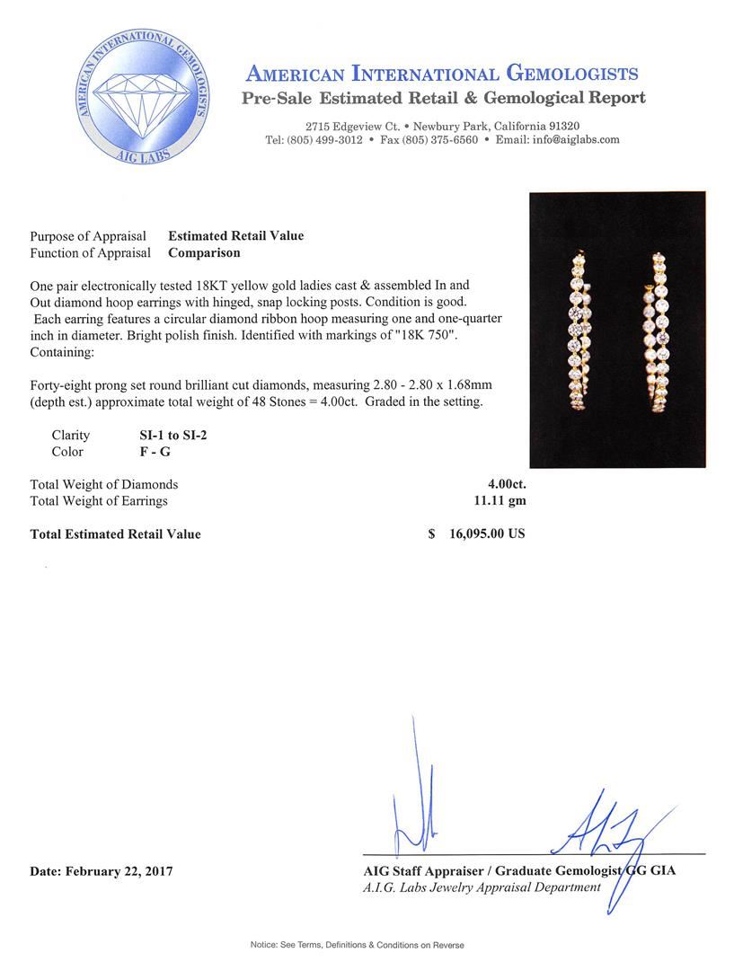 One pair electronically tested 18KT yellow gold ladies cast & assembled In and Out diamond hoop earrings with hinged, snap locking posts. Each earring features a circular diamond ribbon hoop measuring one and one-quarter inch in diameter. Bright polish finish. Identified with markings of '18K 750'. Condition is good. Containing: Forty-Eight prong set round brilliant cut diamonds, measuring 2.80 - 2.80 x 1.68mm (depth est.) approximate total weight of 48 Stones = 4.00ct. Graded in the setting. Clarity SI-1 to SI-2. Color: F - G. Total Weight of Diamonds 4.00ct.. Total Weight of Earrings 11.11gm. AIG Appraised at $16,095.00.