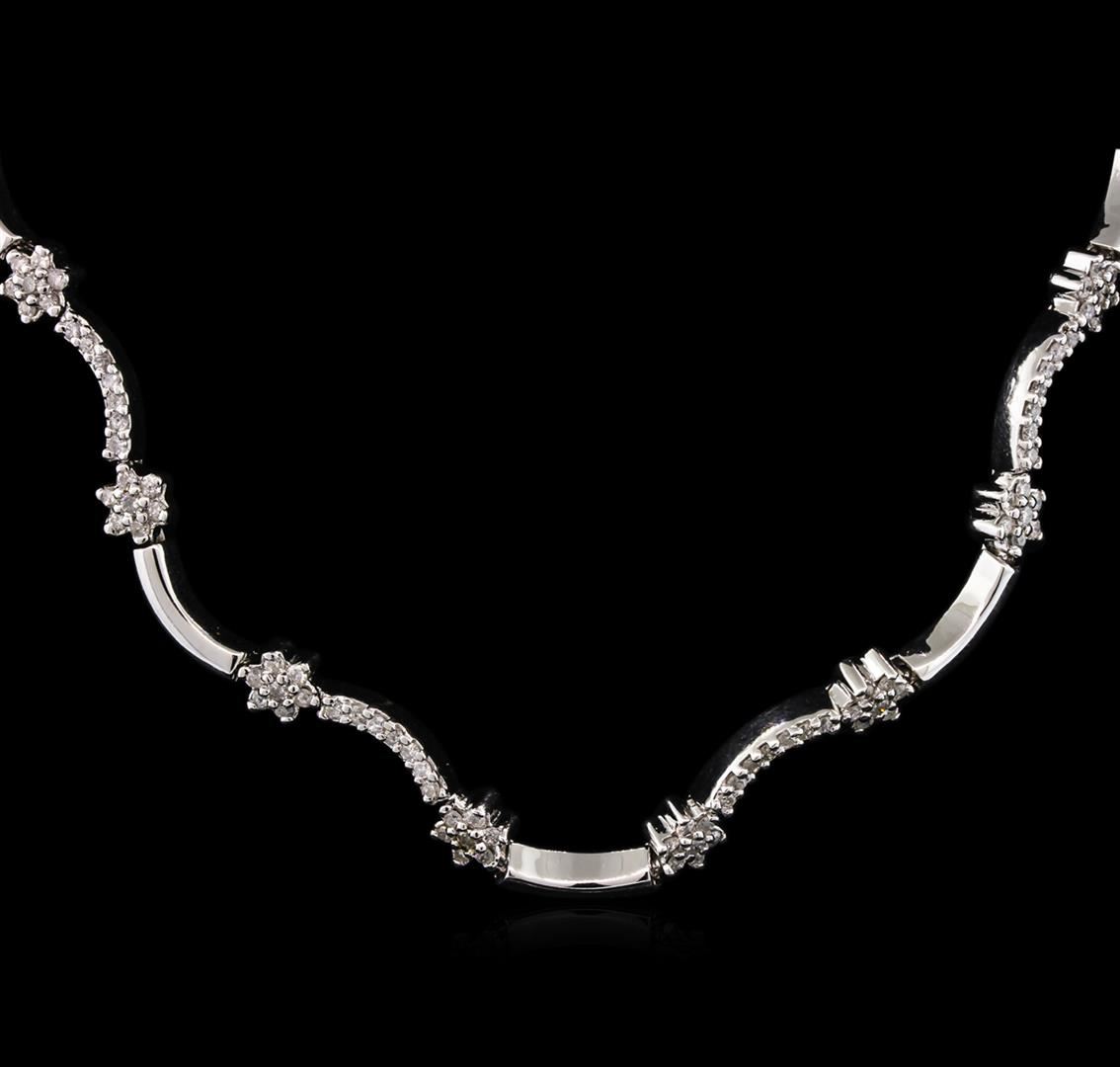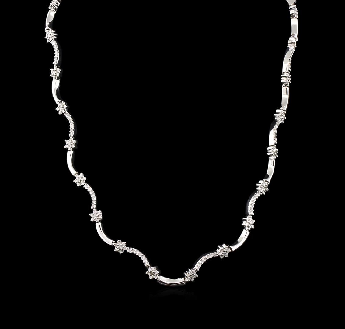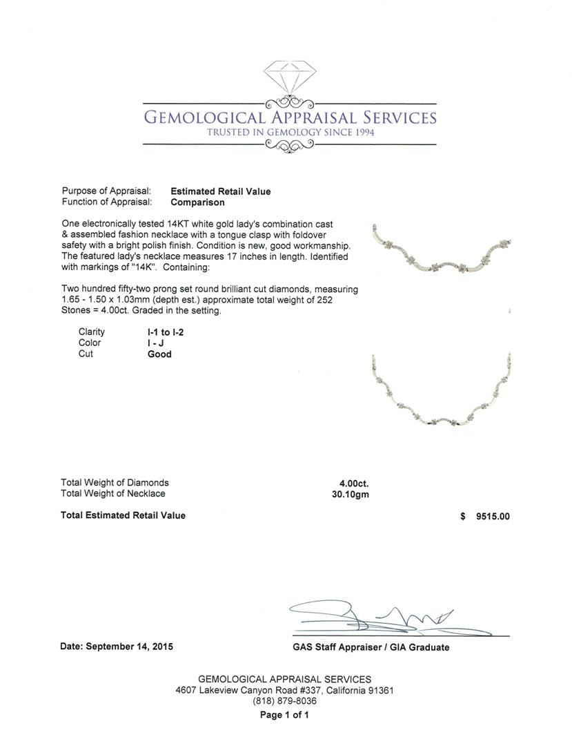 One electronically tested 14KT white gold lady's combination cast & assembled fashion necklace with a tongue clasp with foldover safety with a bright polish finish. The featured lady's necklace measures 17 inches in length. Identified with markings of "14K". Condition is new, good workmanship. Containing: Two Hundred Fifty-Two prong set round brilliant cut diamonds, measuring 1.65 - 1.50 x 1.03mm (depth est.) approximate total weight of 252 Stones = 4.00ct. Graded in the setting. Clarity: I-1 to I-2. Color: I - Good. Total Weight of Diamonds 4.00ct. Total Weight of Necklace 30.10gm. GAS Appraised at $9,515.00.