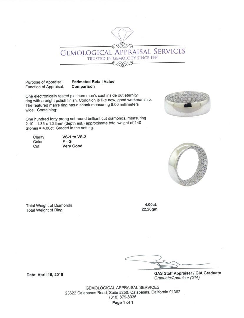 One electronically tested platinum man's cast inside out eternity ring with a bright polish finish. The featured man's ring has a shank measuring 8.00 millimeters wide. Condition is like new, good workmanship. Containing: One Hundred Forty prong set round brilliant cut diamonds, measuring 2.10 - 1.85 x 1.23mm (depth est.) approximate total weight of 140 Stones = 4.00ct. Graded in the setting. Color F - G Clarity VS-1 to VS-2 Cut Very Good. Total Weight of Diamonds 4.00ct.. Total Weight of Ring 22.20gm GAS Appraised at $14285.00. GAS Appraised at $14,285.00.