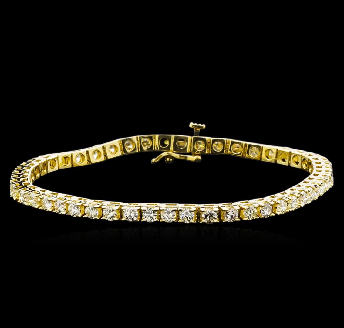 One electronically tested 14KT yellow gold ladies cast & assembled diamond tennis bracelet with a bright polish finish. Six and three-quarter inch length bracelet composed of a flexible ribbon of diamonds, terminating in a concealed clasp with safety. Identified with markings of "14K". Trademark is B&B. Condition is new, good workmanship. Tennis bracelets & necklaces got their unusual name from an incident involving the U.S. professional tennis player Chris Evert during a tennis match in the 1980's. Evert had been wearing an expensive diamond bracelet, an inline string of individually-set diamonds. Previously these bracelets were known as eternity bracelets. When the clasp snapped during play, she asked the officials to stop the tennis match until the bracelet could be found. Since that day, bracelets and necklaces featuring an inline string of diamonds have been called tennis bracelets and tennis necklaces. Containing: Fifty prong set round brilliant cut diamonds, measuring 2.80 - 2.70 x 1.65mm (depth est.) approximate total weight of 50 Stones = 4.00ct. The color grade reflects the entire range of color for this group. Graded in the setting. Clarity: VS-2 to SI-2. Color: H - K. Total Weight of Diamonds 4.00ct. Total Weight of Bracelet 11.19gm. AIG Appraised at $13,665.00.